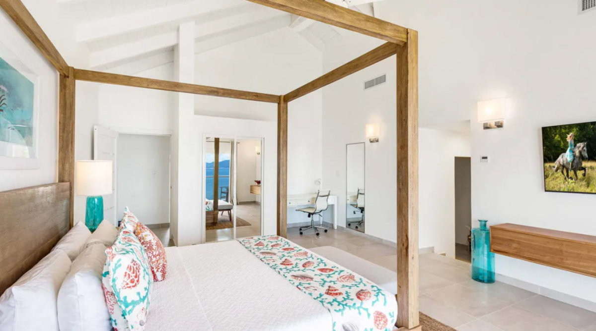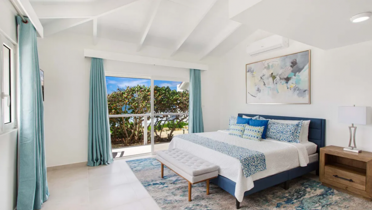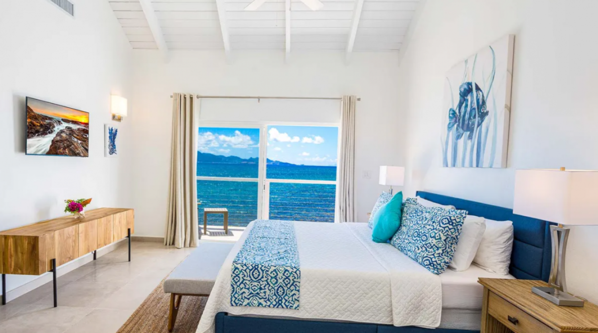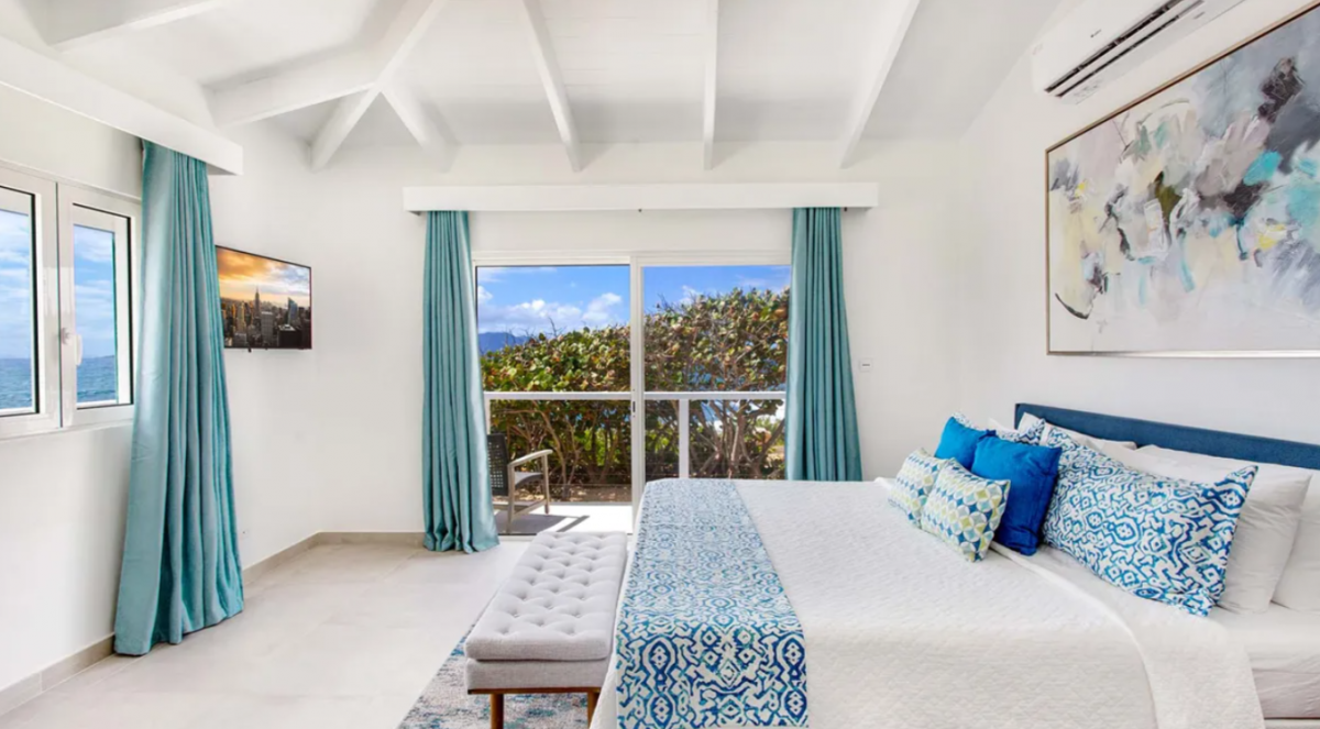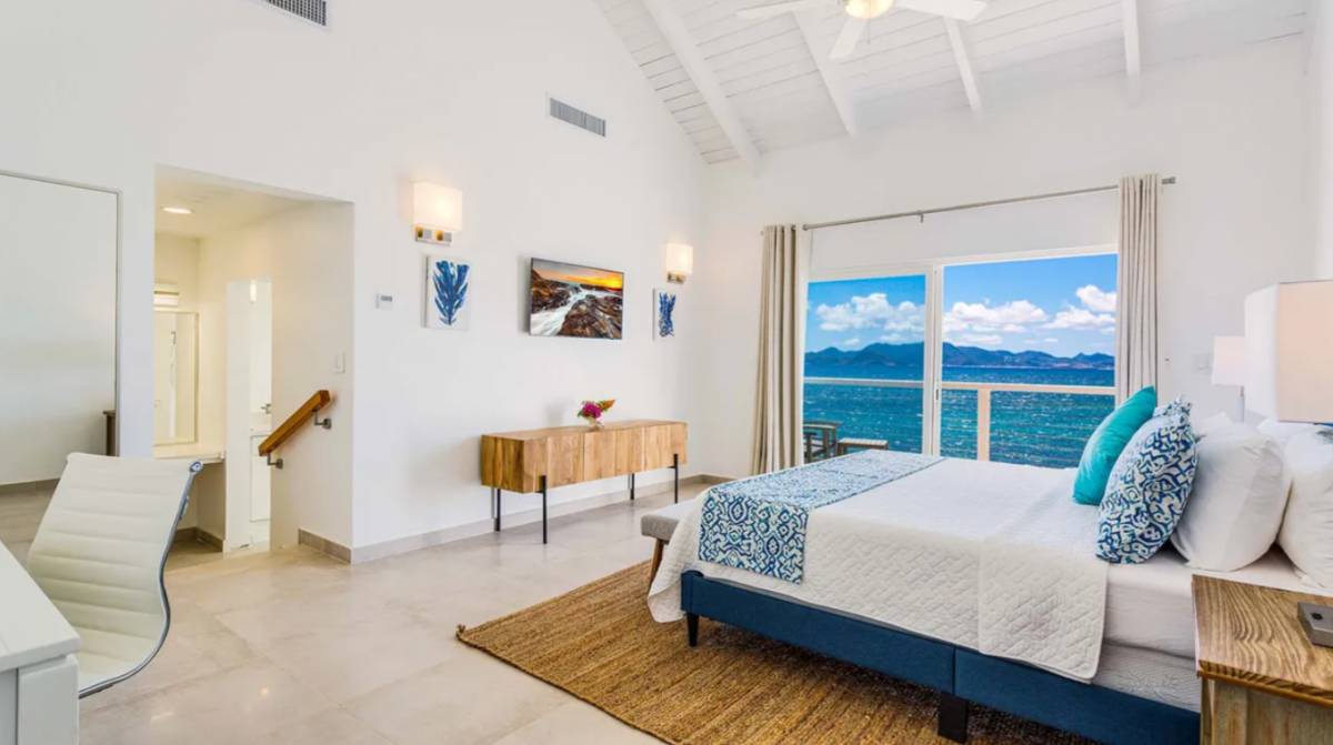 Bedroom 1: This room is located in the Main House and is equipped with a king-sized bed, a walk-in closet, air conditioning, a ceiling fan, a television, a desk, and an ensuite bathroom with a shower. Bedroom 1 also has a furnished verandah that overlooks the sea and the island of St. Martin in the distance.