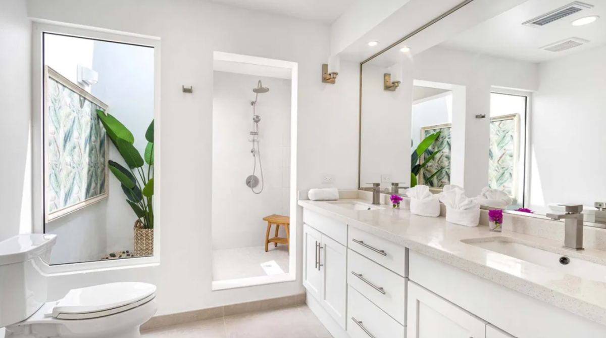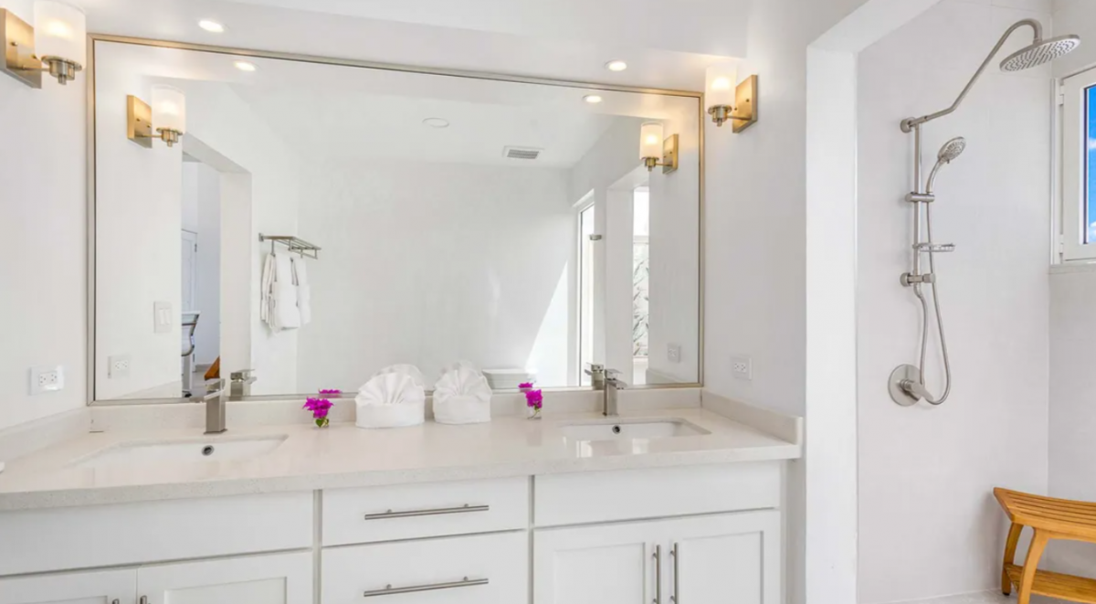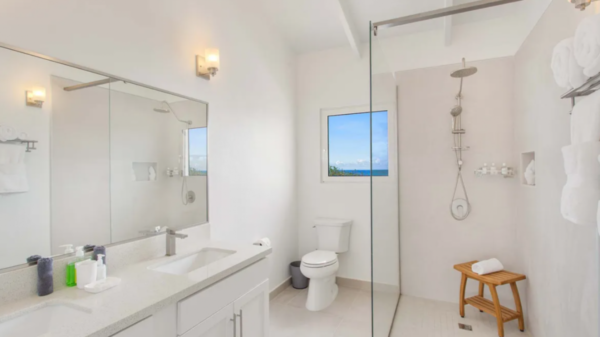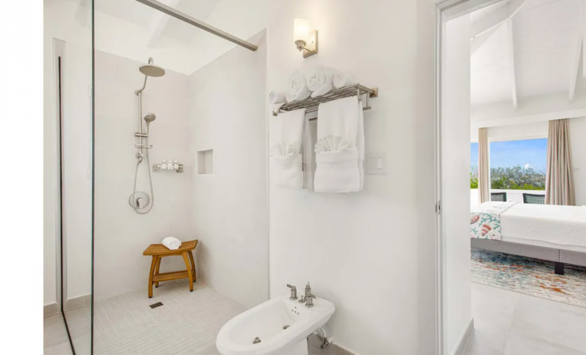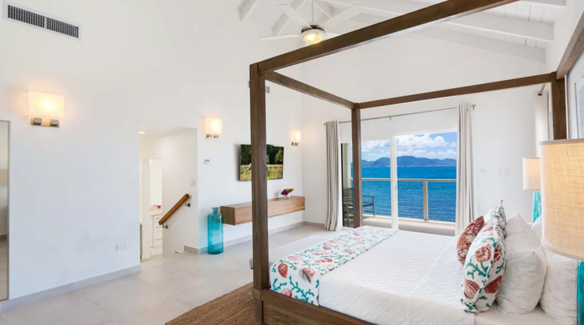Bedroom 1: This room is located in the Main House and is equipped with a king-sized bed, a walk-in closet, air conditioning, a ceiling fan, a television, a desk, and an ensuite bathroom with a shower. Bedroom 1 also has a furnished verandah that overlooks the sea and the island of St. Martin in the distance.