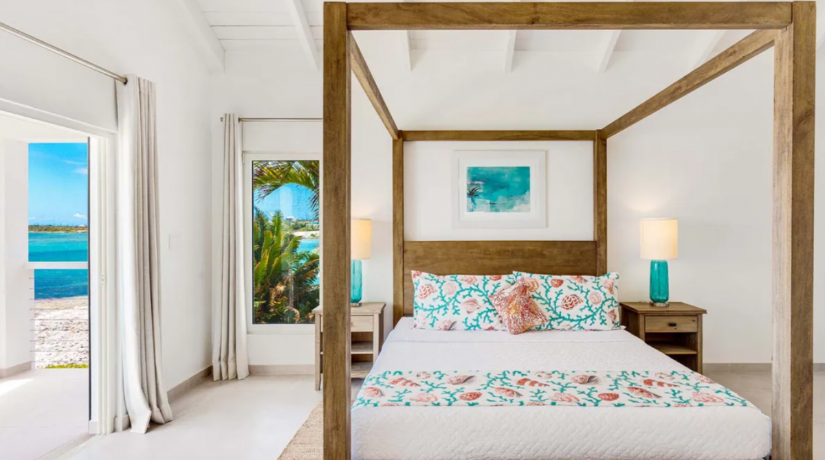 Bedroom 4: This room is located in the Bungalow and is equipped with a king-sized bed, air conditioning, a ceiling fan, a television, and an ensuite bathroom with a shower. Bedroom 4 also has a private furnished balcony with a sea view.
