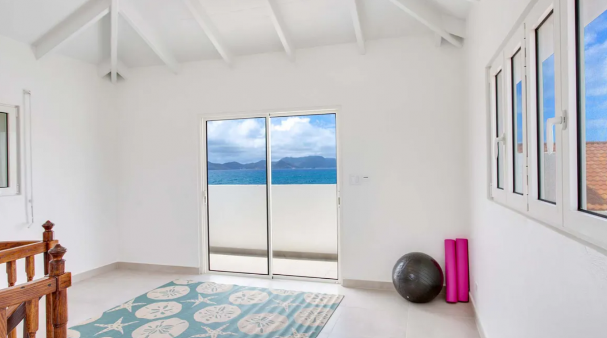 Bedroom 2: This room is located in the Main House and is equipped with a king-sized bed, air conditioning, a ceiling fan, a television, a desk, and an ensuite bathroom with a shower. Bedroom 2 also has a furnished verandah that overlooks the sea and the island of St. Martin in the distance.