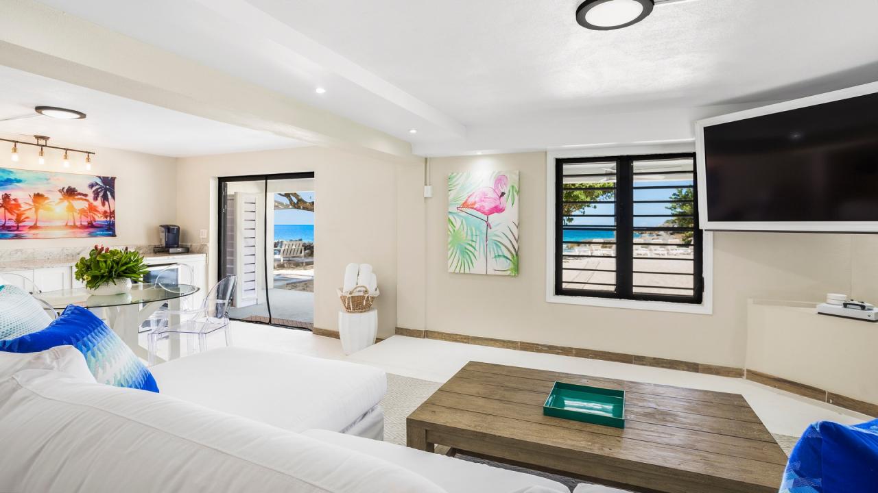 Bedroom 4: This room is equipped with a king-sized bed, air conditioning, a television, a kitchenette, a dining and lounge area, and an ensuite bathroom with an outdoor shower. This room opens onto a patio with direct access to beach and sea views.