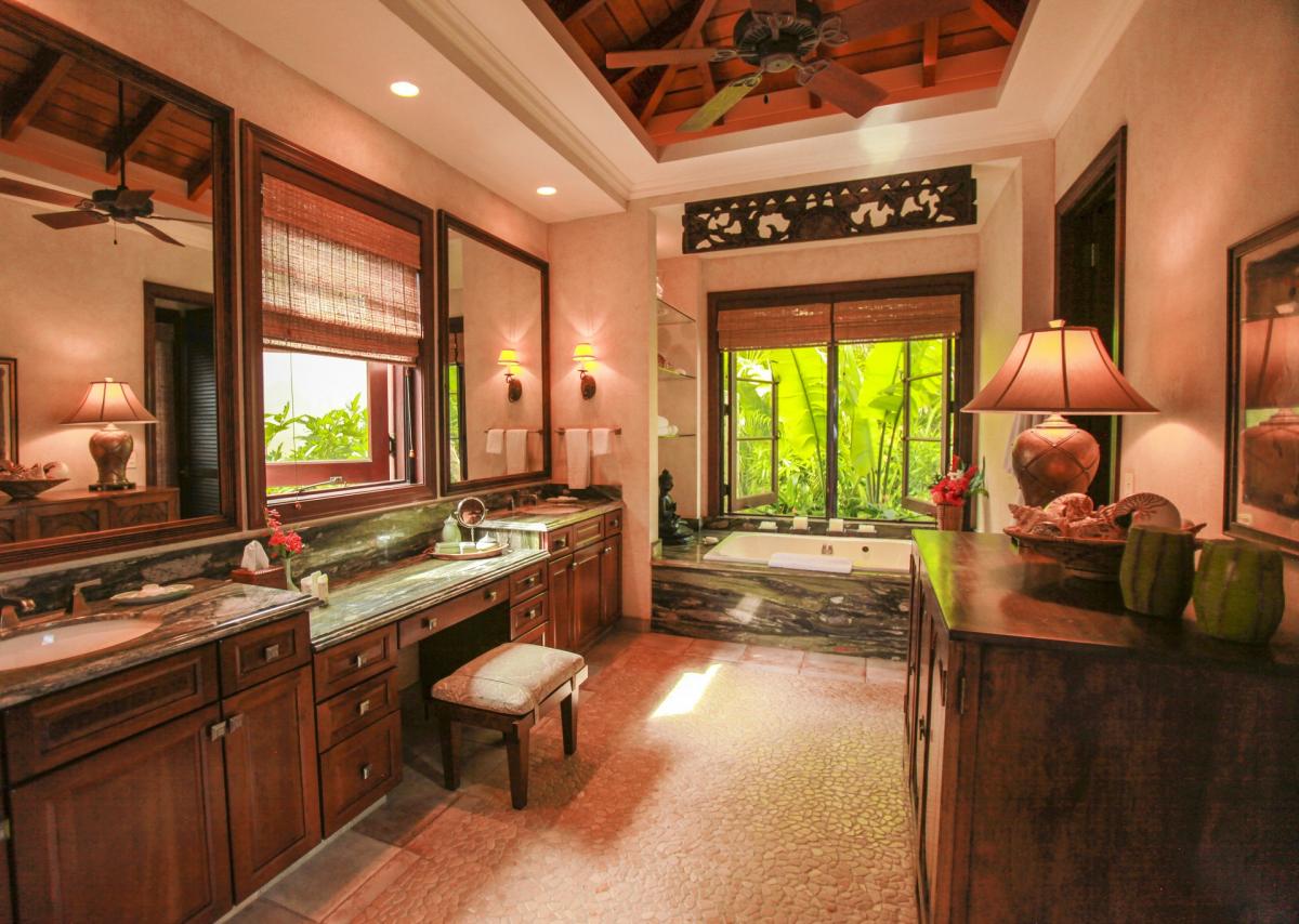 Bedroom 1: This room is located on the upper level and is equipped with a king-sized bed, a walk-in closet, air conditioning, a television, a fridge, and an ensuite bathroom with a bathtub, an indoor and outdoor shower, and double vanities. Bedroom 1 also has a private plunge pool and a verandah with lounge chairs that overlook the Caribbean Sea.