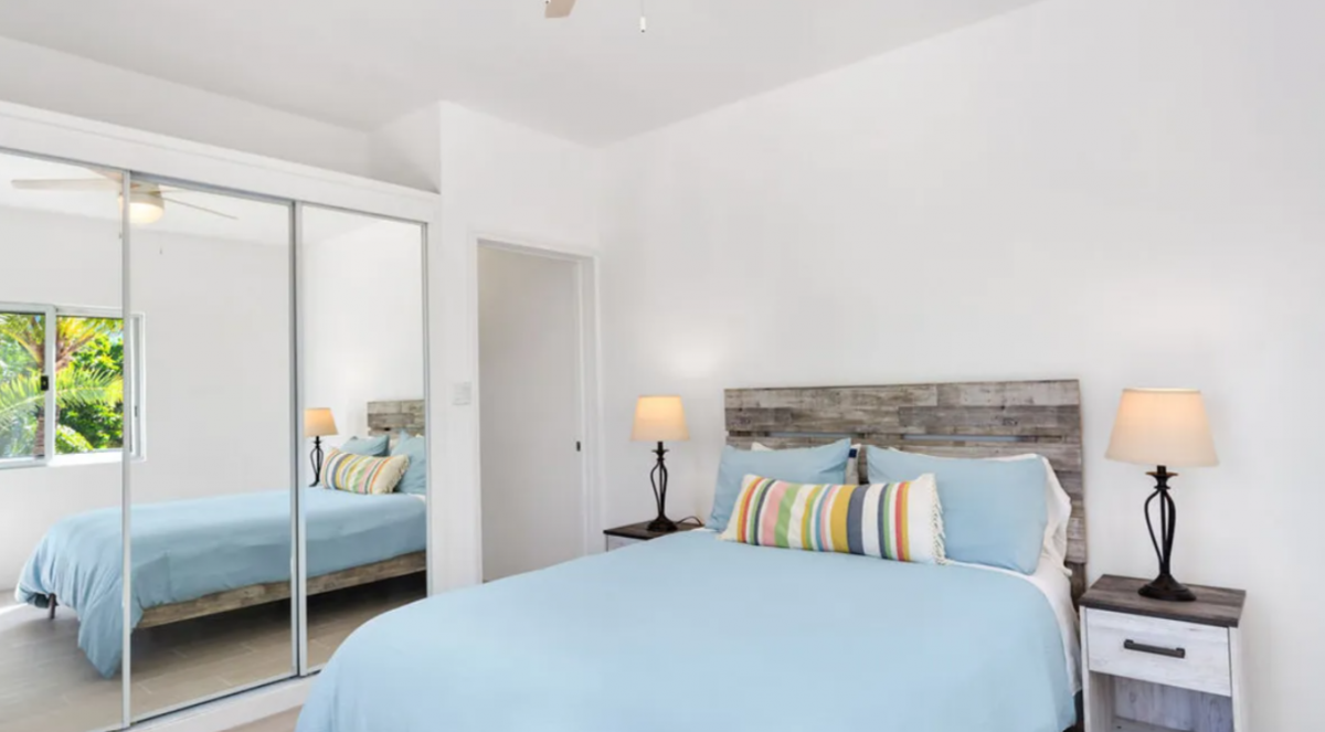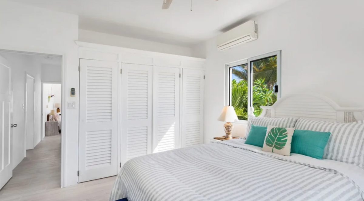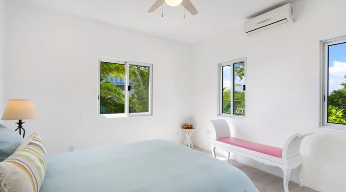 Bedroom 3: This room is equipped with a queen-sized bed, air conditioning, a ceiling fan, and a shared bathroom with a bathtub and shower combination.