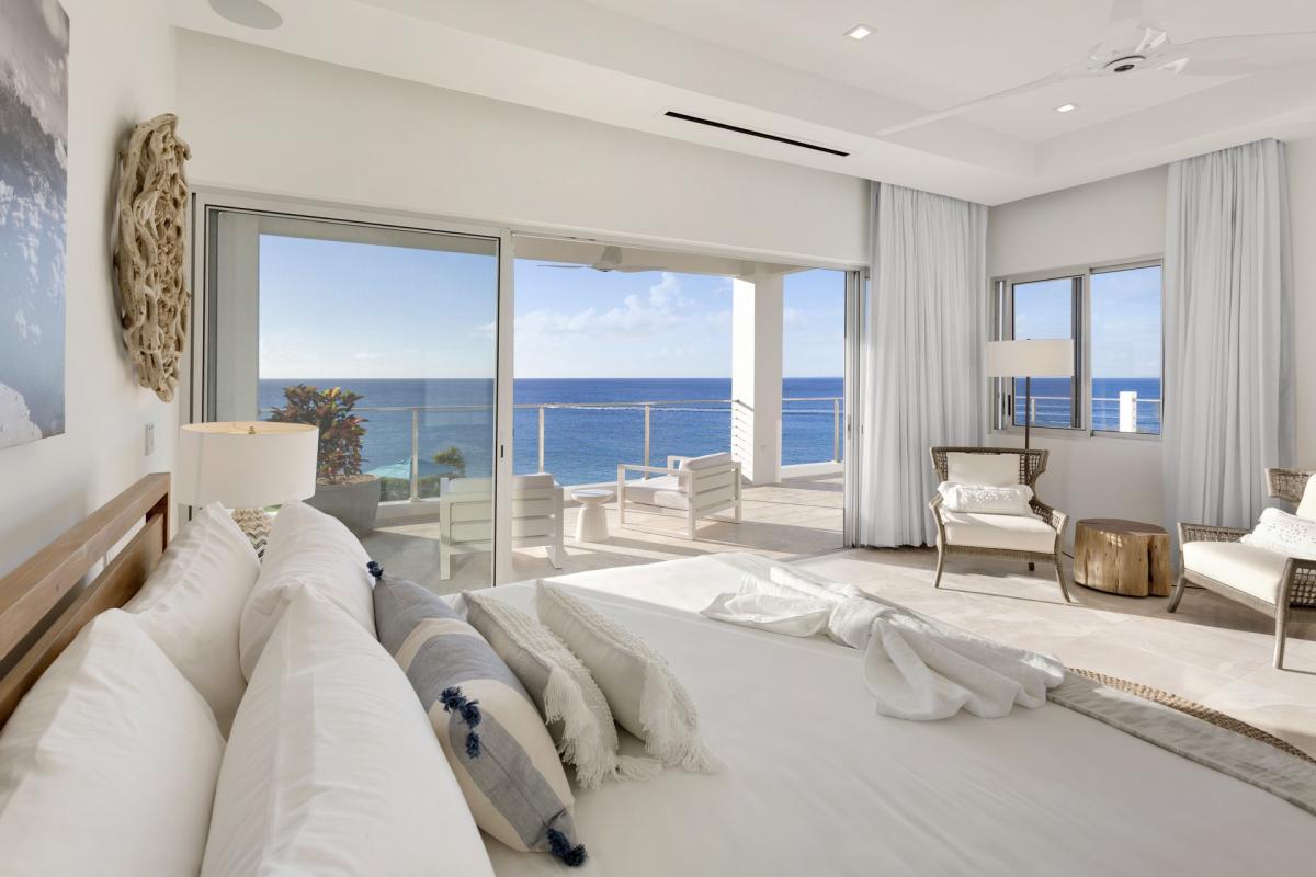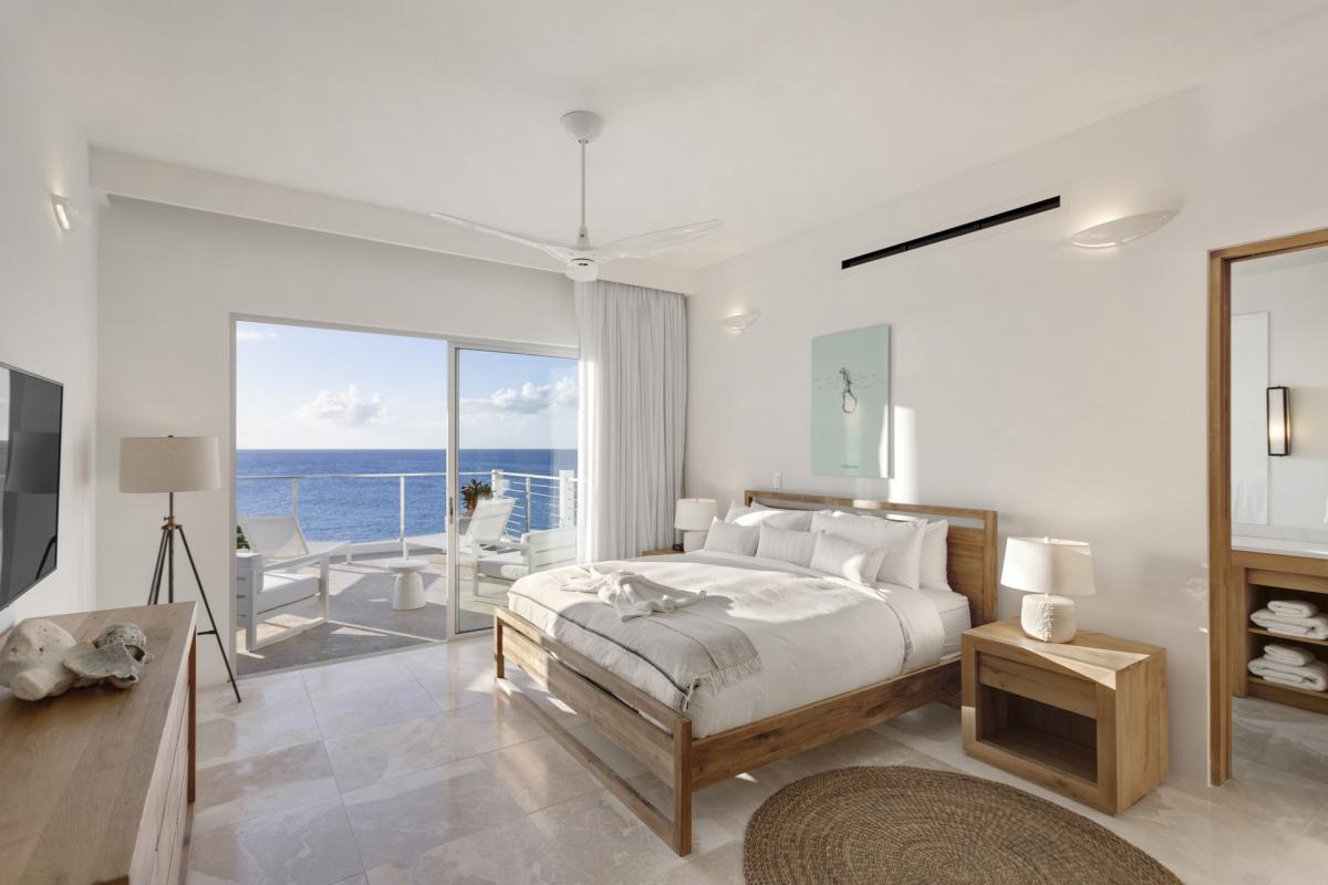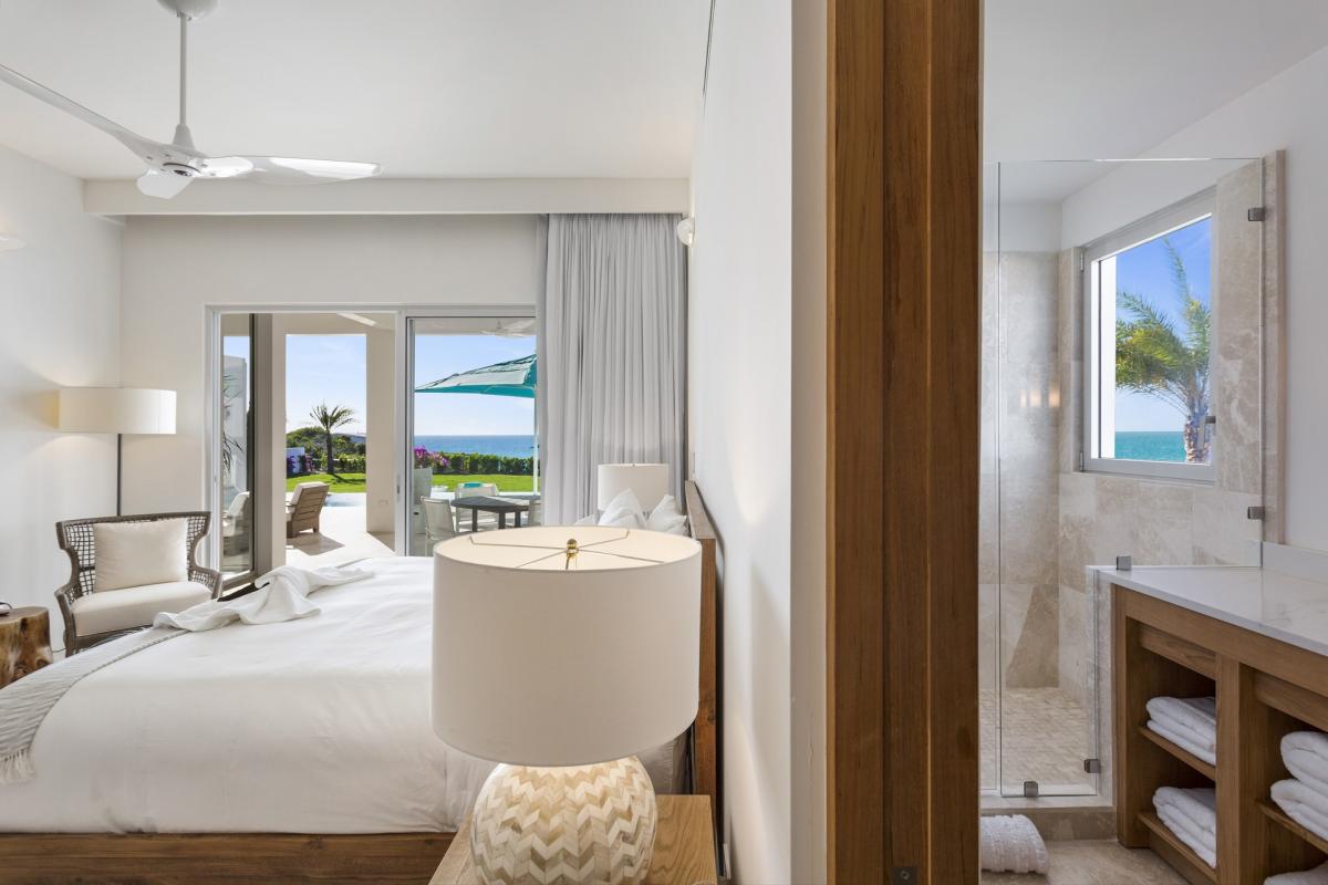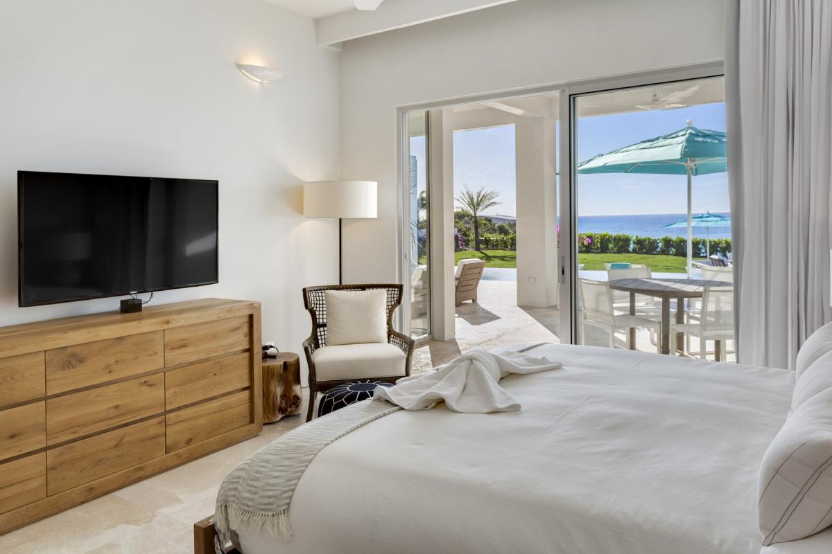Bedroom 5: This room is located on the lower level of the main house and is equipped with a king-sized bed, a TV, AC, a ceiling fan, access to a furnished terrace leading to the pool that features an ocean view, and an ensuite bathroom with an indoor and outdoor shower.