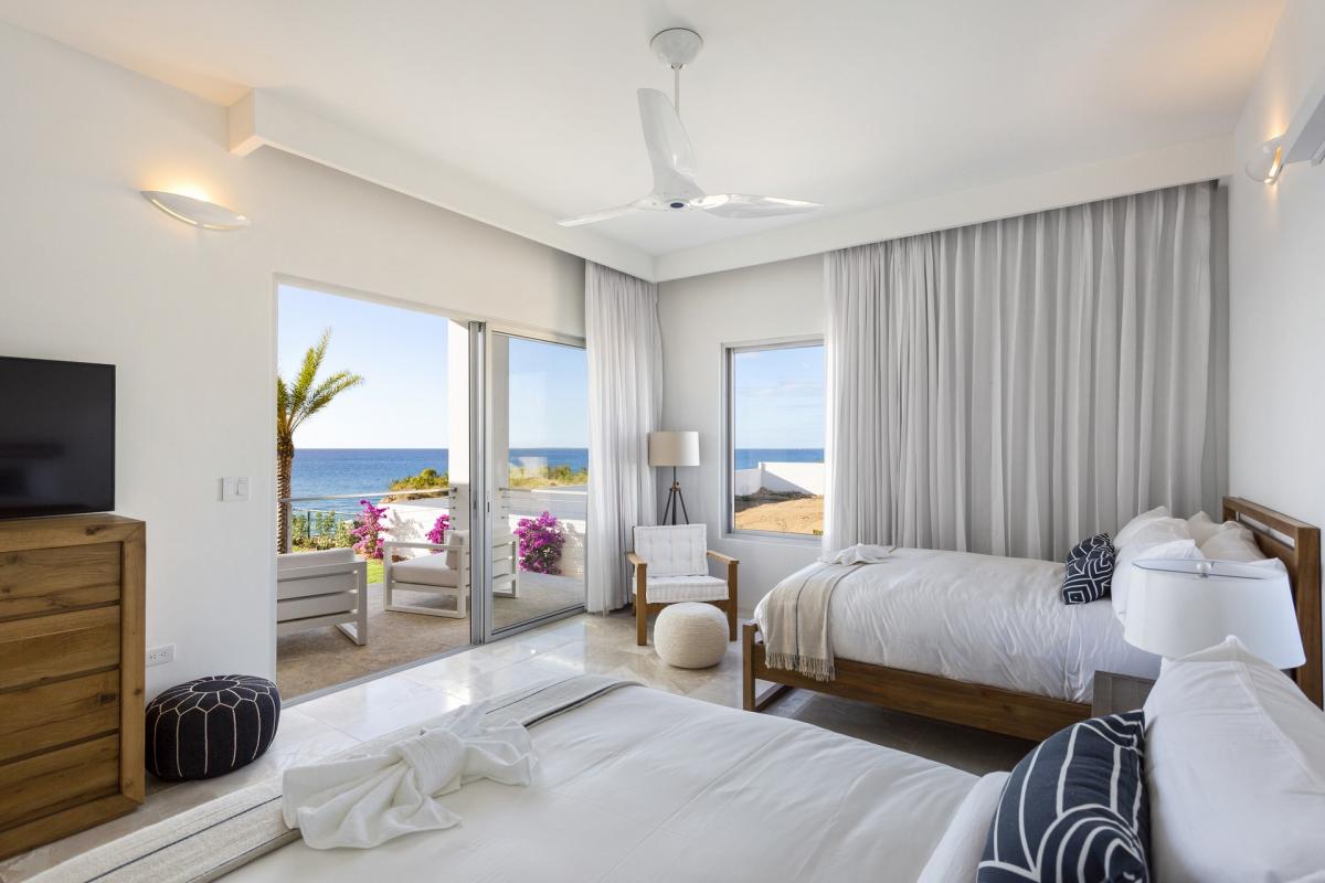 Bedroom 4: This room is located on the upper level of the main house and is equipped with two queen-sized bed, a TV, AC, a ceiling fan, access to a furnished terrace with an ocean view, and an ensuite bathroom with a shower.