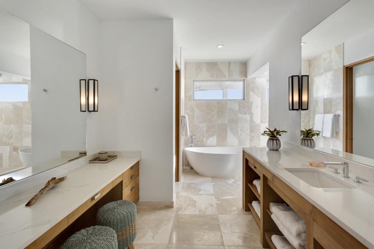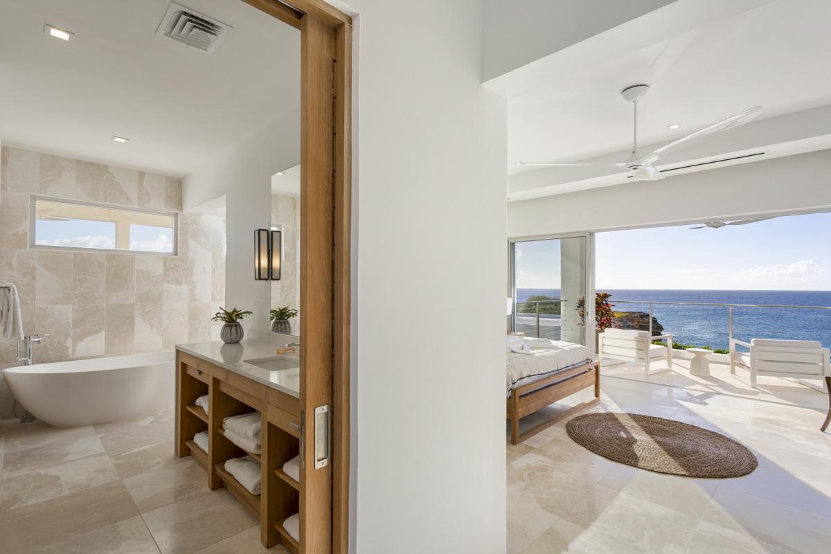 Primary Bedroom: This room is located on the upper level of the main house and is equipped with a king-sized bed, AC, ceiling fans, access to a furnished terrace with an ocean view, and an ensuite bathroom with a bathtub and shower.