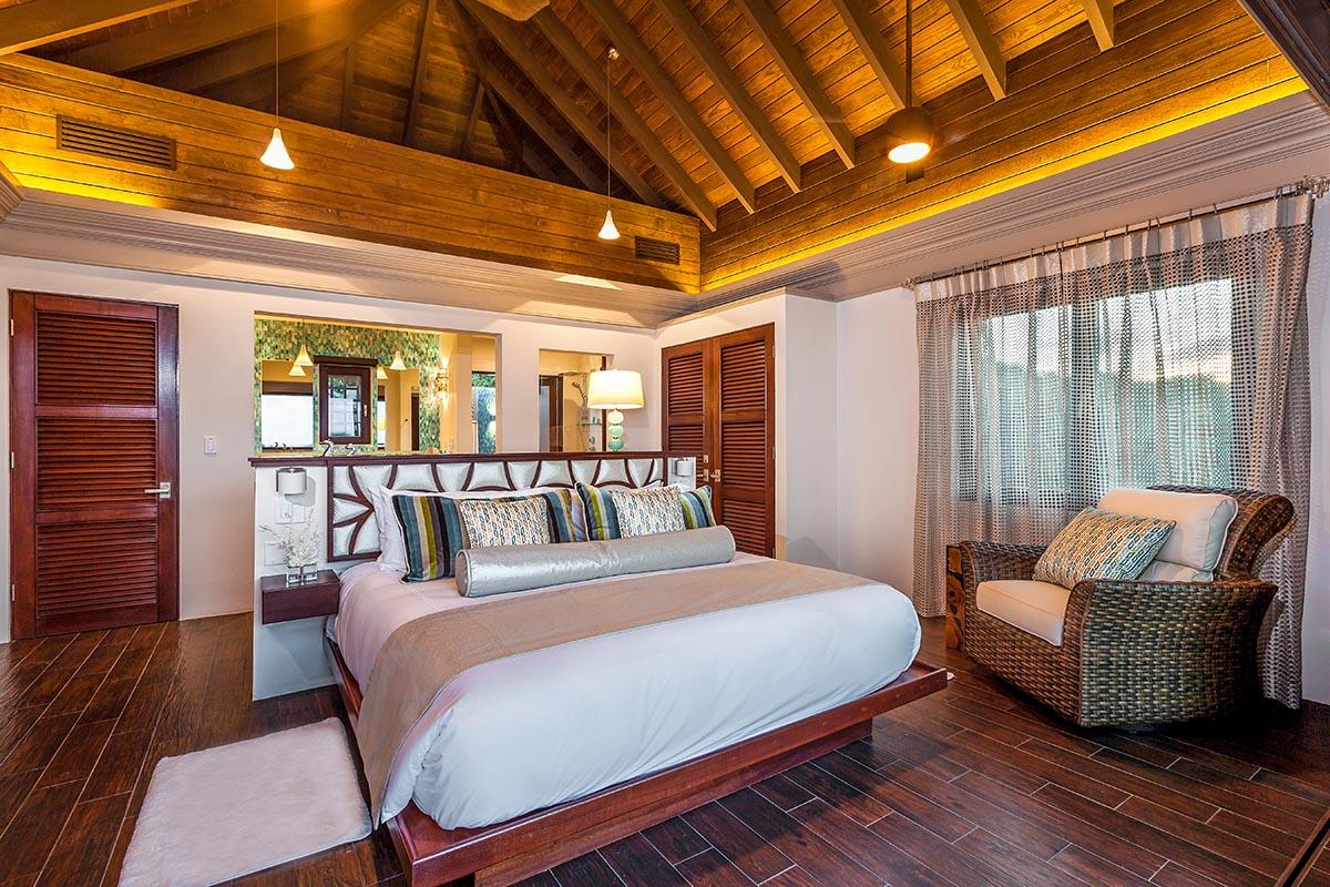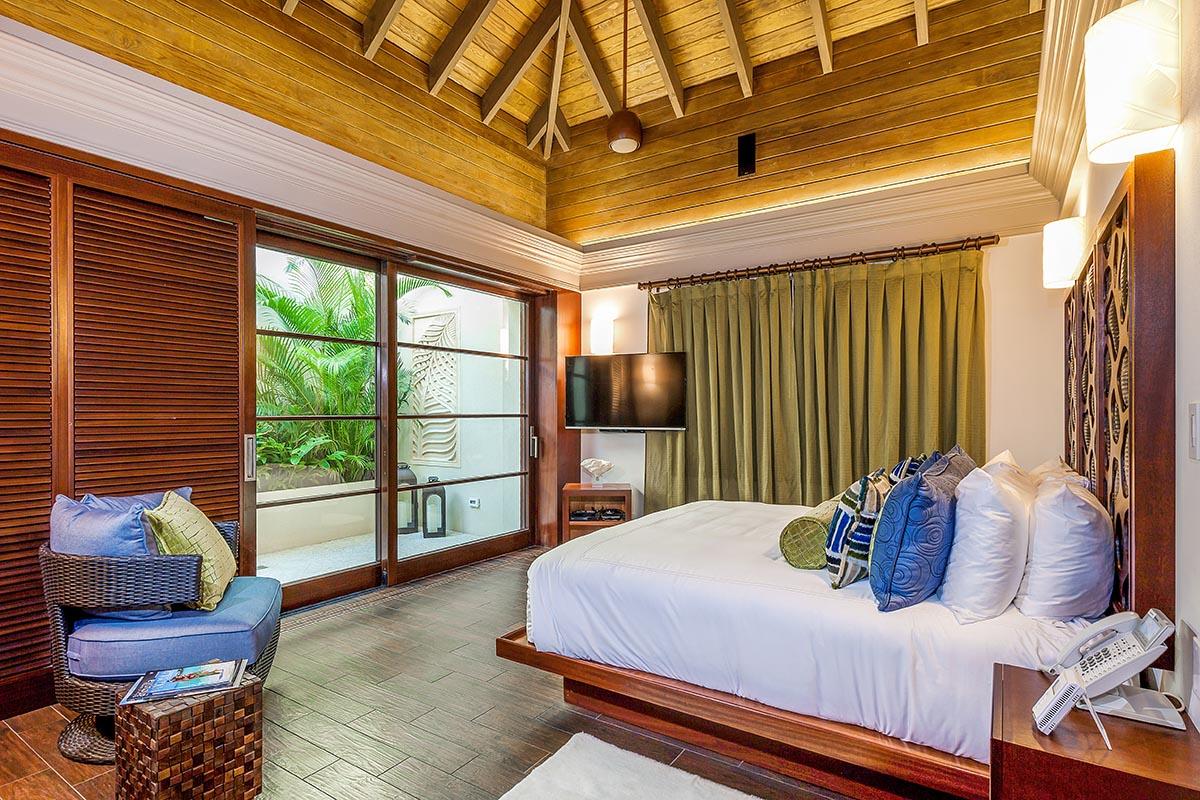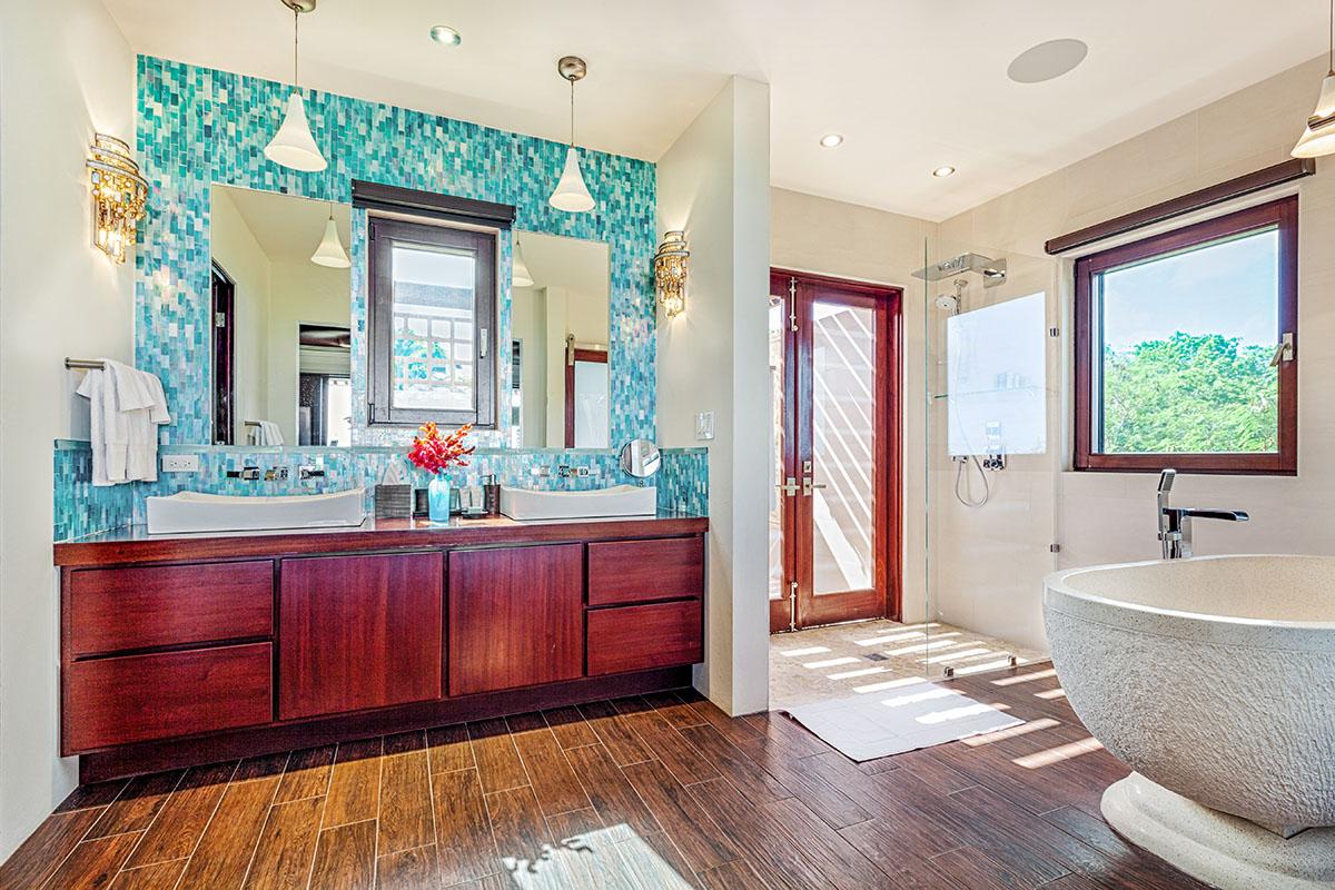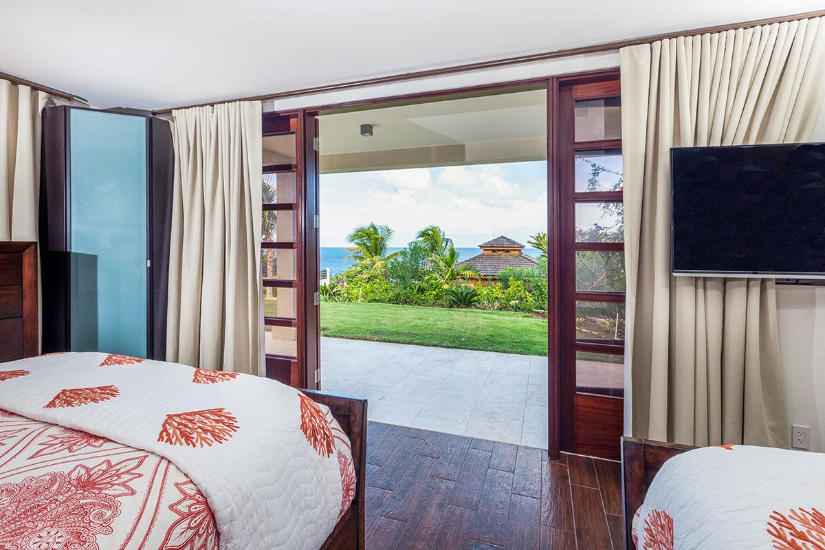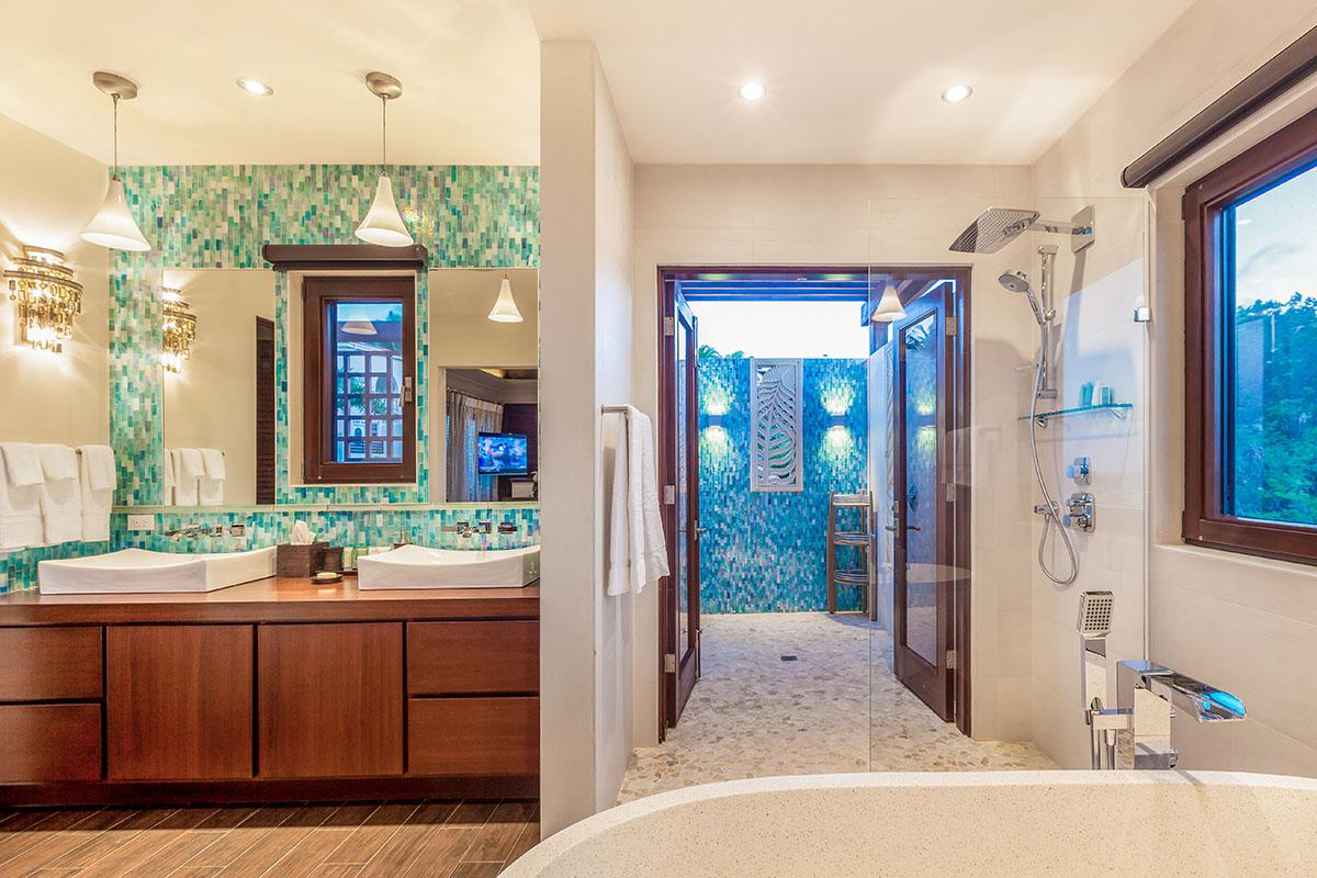 full bathroom and separate powder room shared with bedroom 7, stand-alone shower and bathtub, TV, terrace- Bedroom 9: Cabana bedroom with king bed, ensuite bathroom with stand-alone shower, TV, wrap-around terrace with garden and ocean views