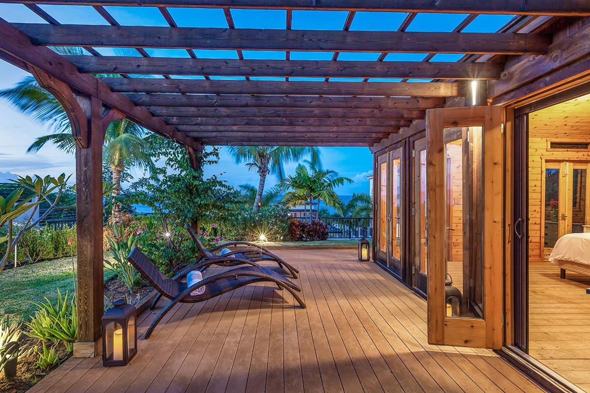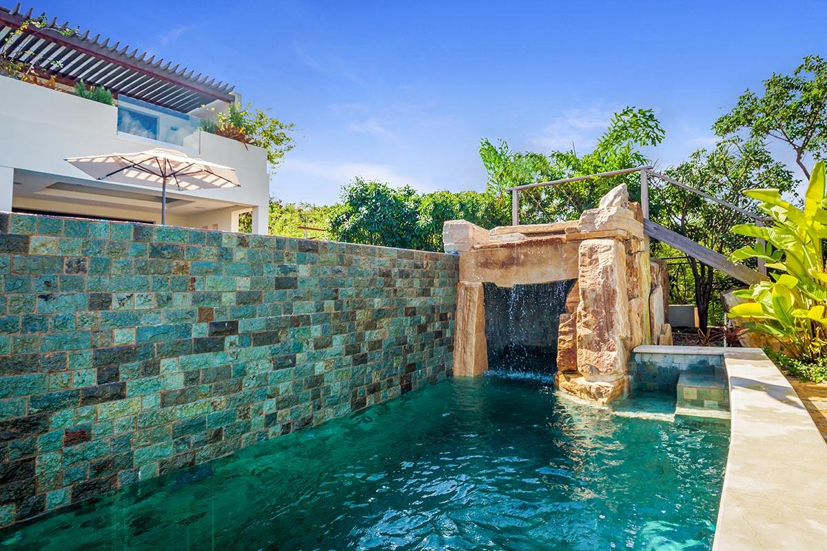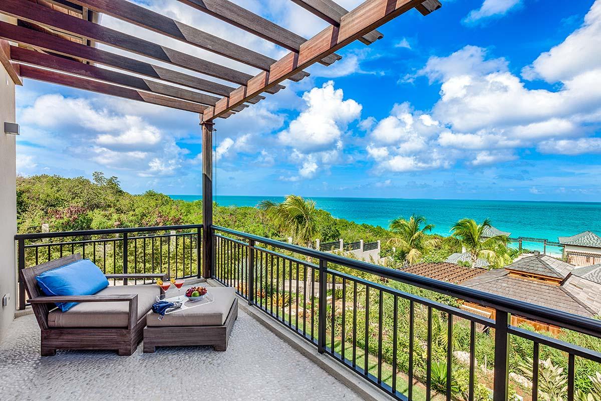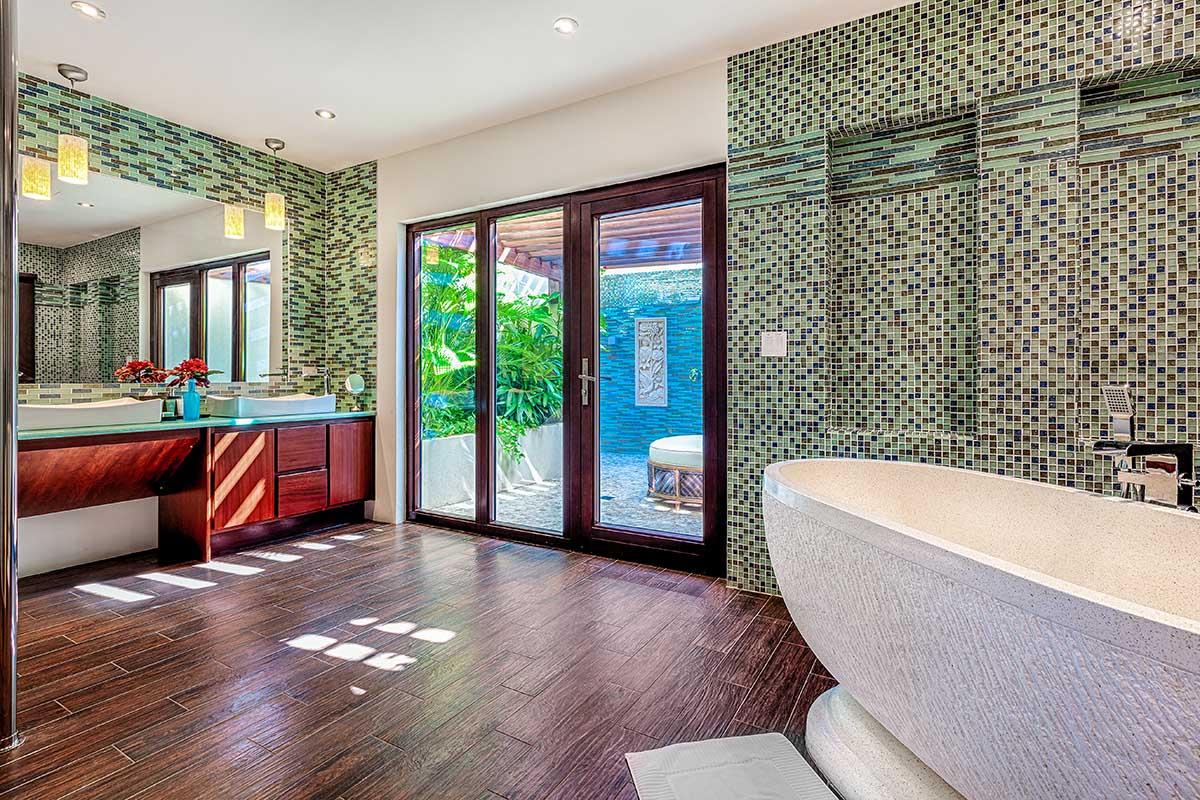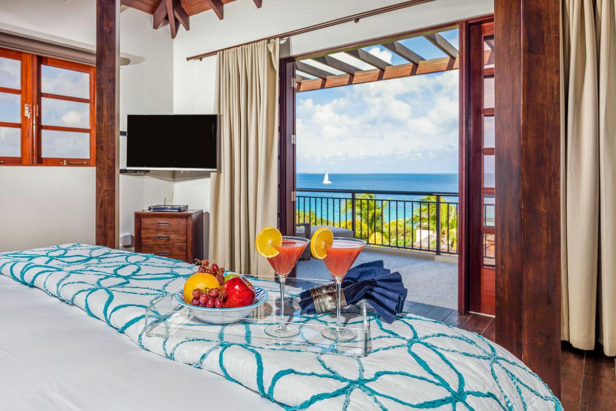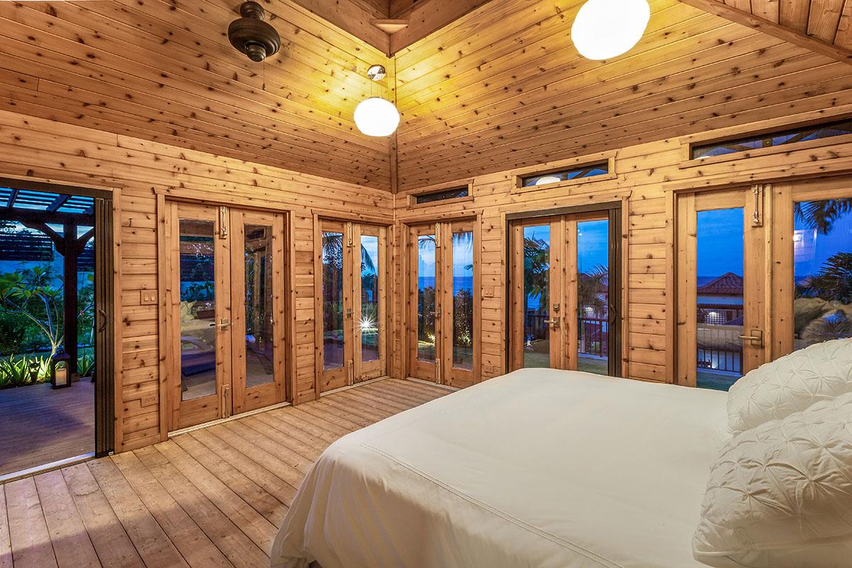 full bathroom and separate powder room shared with bedroom 7, stand-alone shower and bathtub, TV, terrace- Bedroom 9: Cabana bedroom with king bed, ensuite bathroom with stand-alone shower, TV, wrap-around terrace with garden and ocean views
