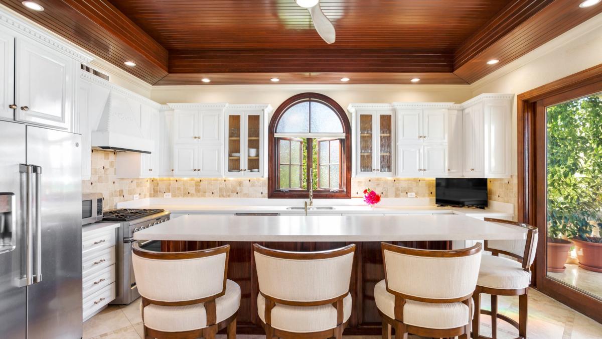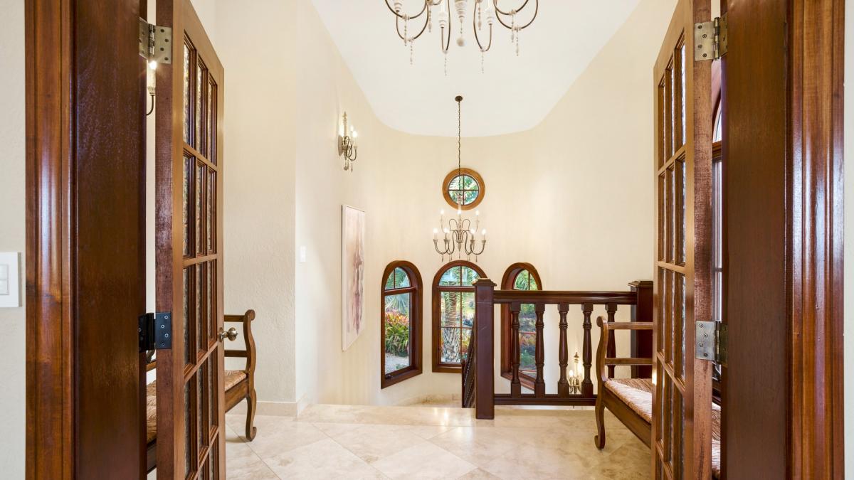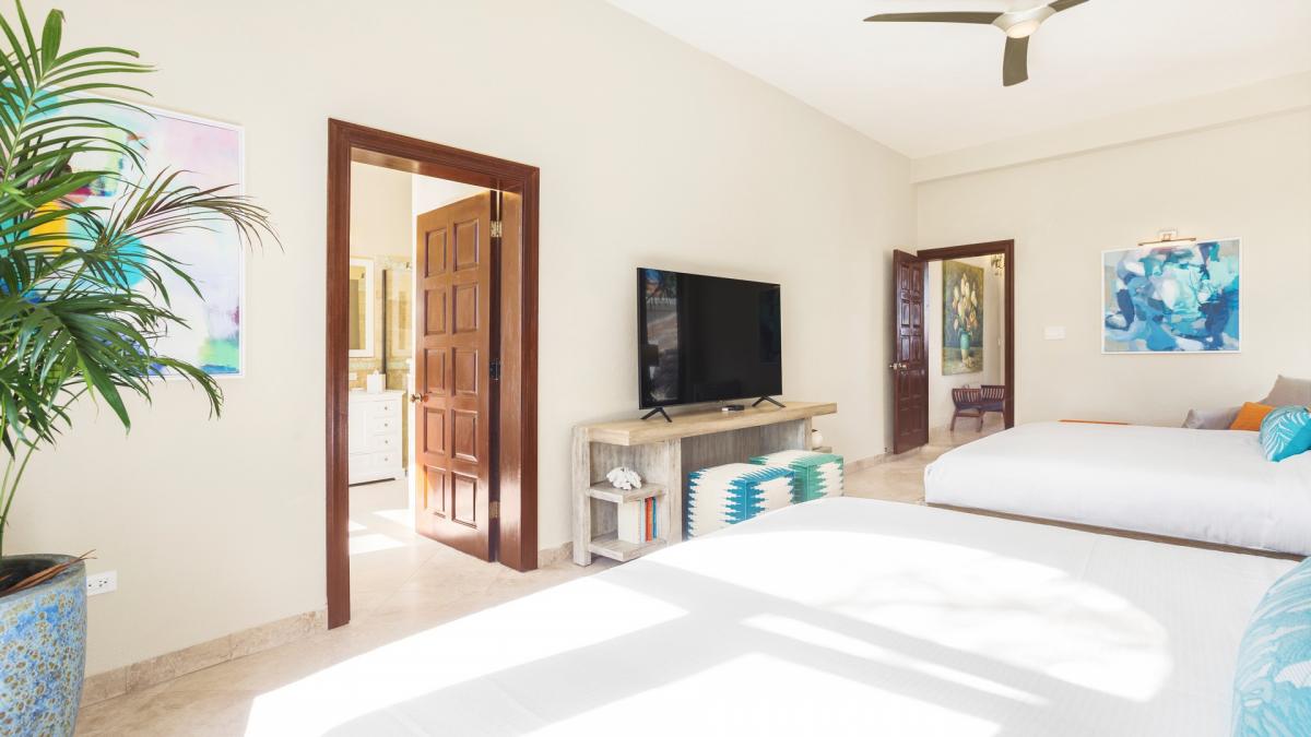 Bedroom 5: This room is located on the main level and it is equipped with one king-sized bed, air conditioning, a television, and an ensuite bathroom with a walk-in shower. This room also opens onto a patio with access to the pool area with Caribbean sea views.