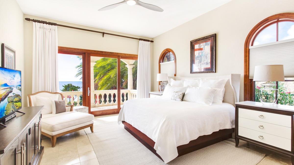 Bedroom 4: This room is located on the main level and it is equipped with one king-sized bed, air conditioning, a ceiling fan, a television, and an ensuite bathroom with a walk-in shower. This room also opens onto a balcony with access to the pool with Caribbean sea views.