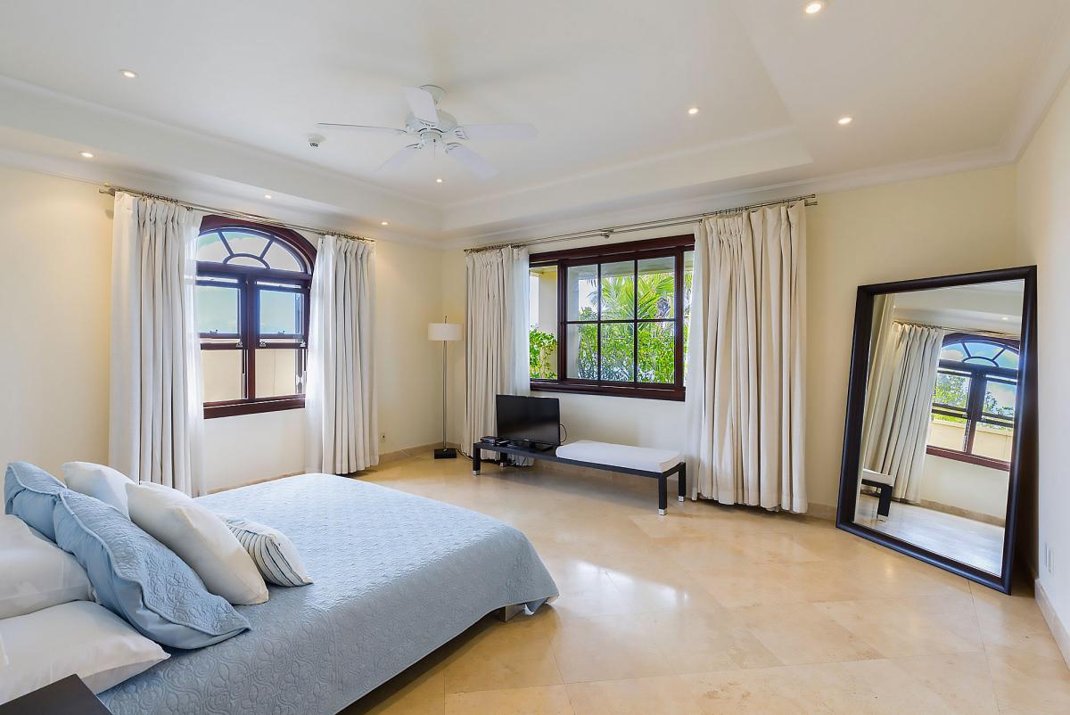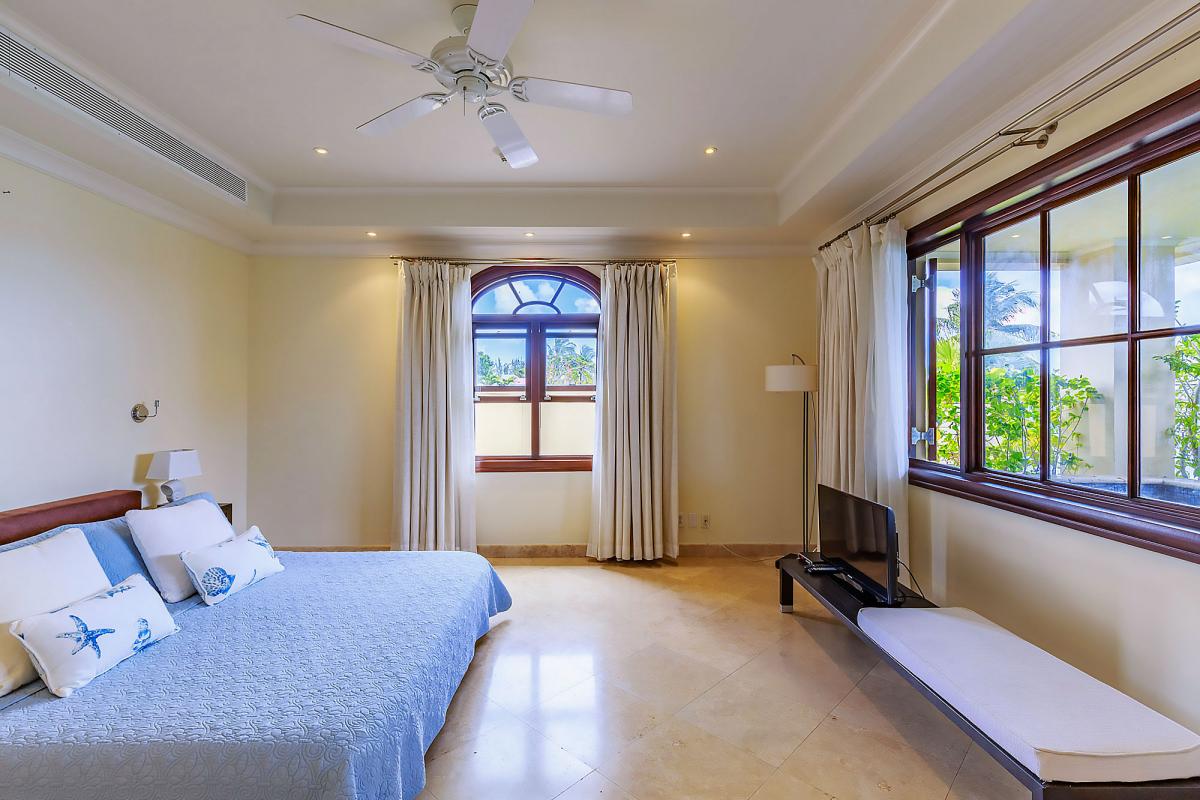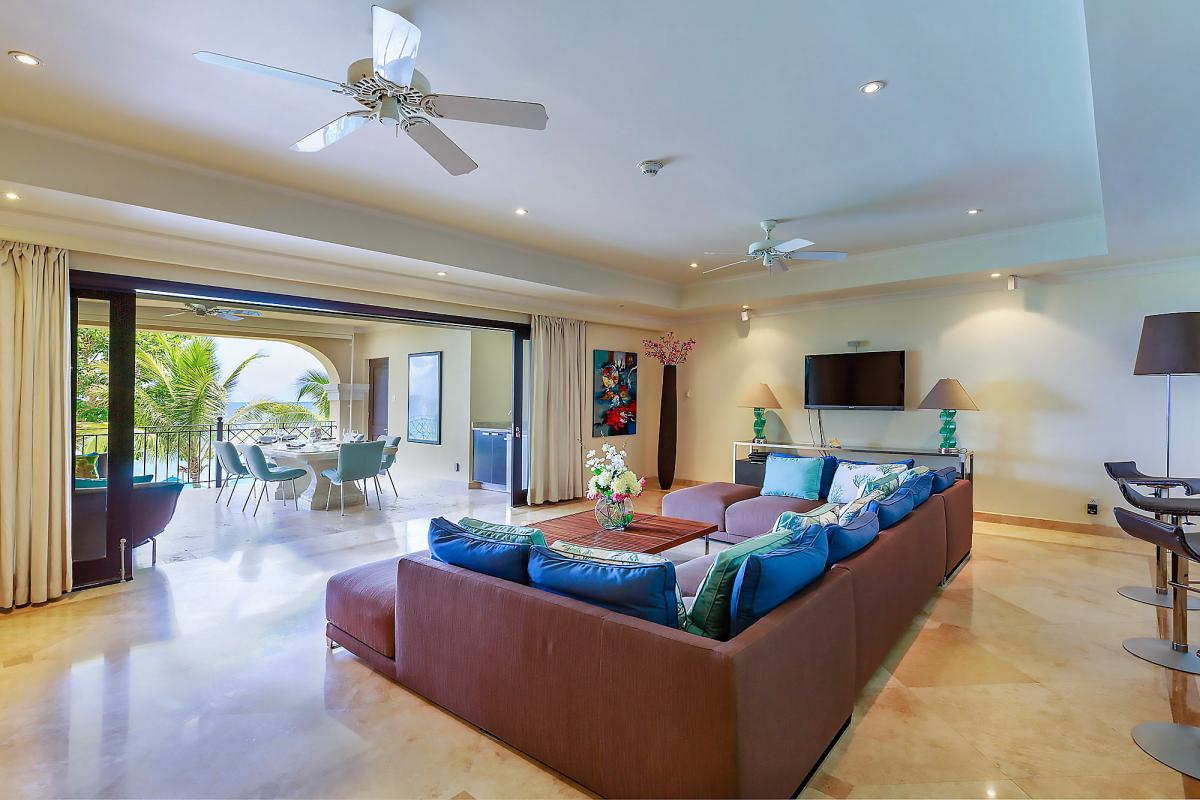 Inside, an open-plan living area is also perfect for entertaining. This area has a flat-screen TV, surround sound, and sliding glass doors that open to the terrace. Three nicely sized bedrooms each equipped with air conditioning, ceiling fans, and ensuite bathrooms. The master bedroom has a prime seafront location.