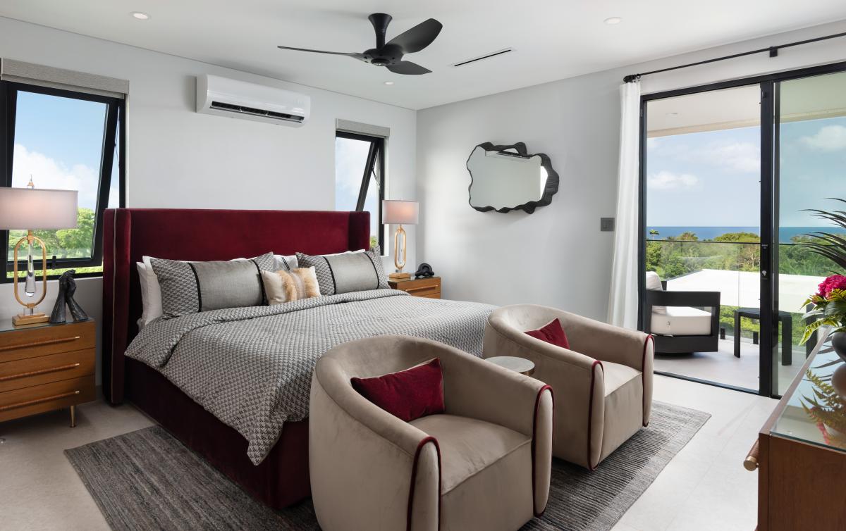 Each of the four bedrooms features its own character, with modern finishes, vibrant accents, and private patios or terraces designed for quiet mornings or unwinding after a long day in the sun. Two bedrooms are located on the ground floor and two upstairs, where you’ll also find a secondary lounge and a private office—ideal if a little work needs to happen during your Barbados luxury villa stay. Thoughtfully designed for adults, the home blends comfort and style in every corner.