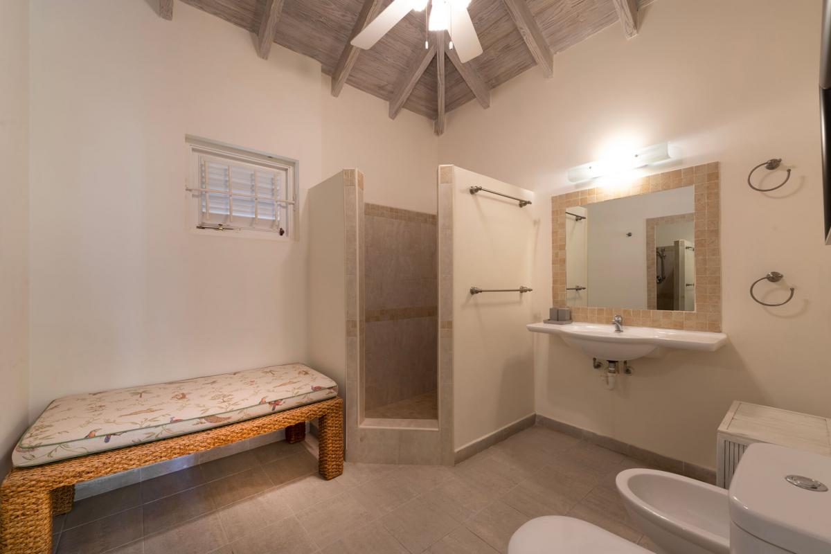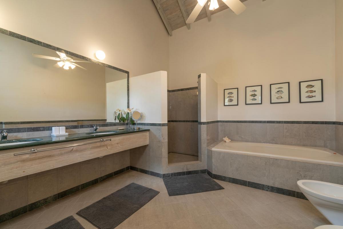 The villa boasts a gorgeous pool terrace with wooden decking and stone surroundings, creating the ultimate outdoor living area. There is also an al fresco dining area and spacious lounge area, perfect for guests to enjoy the beautiful Caribbean weather. Not only is there a shared outdoor living area, but each bedroom also has its own outdoor space and sundeck to give guests a chance to soak up the sun in private.