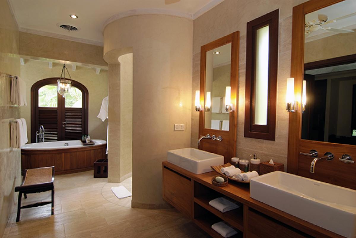 Canoten’s natural finishes – including stone, travertine marble, hardwood and wallaba shingles – blend naturally into the environment, offering the perfect essence of tropical living. The well appointed kitchen features luxury finishes and SMEG appliances. The spacious great room features spectacular views out to sea through the large stackable sliding doors.