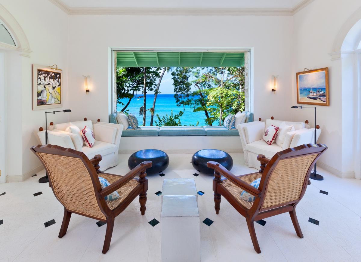 Crystal Spring's main house is home to a large beautifully appointed living room inviting guests to relax while listening to the lull of the waves just outside. The additional sitting area features the architect's signature trademark: a large panoramic window with views of the sea. A patio and bar are annexed and offer cool places to relax, converse, or enjoy a pre-dinner cocktail. Move to the seaside patio or tea house living room to enjoy a minute to yourself or watch the sunseat.