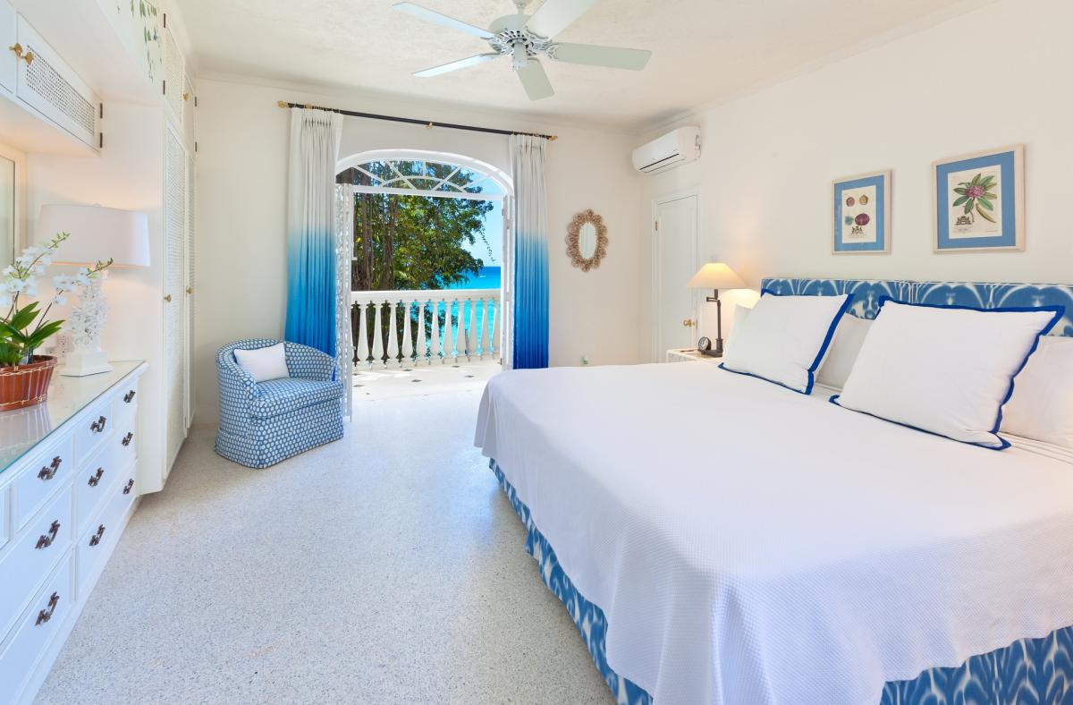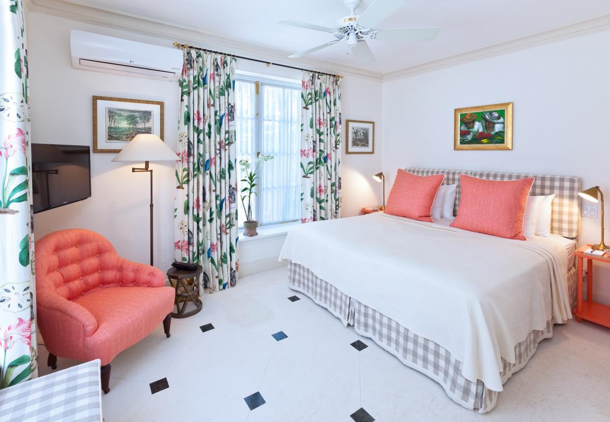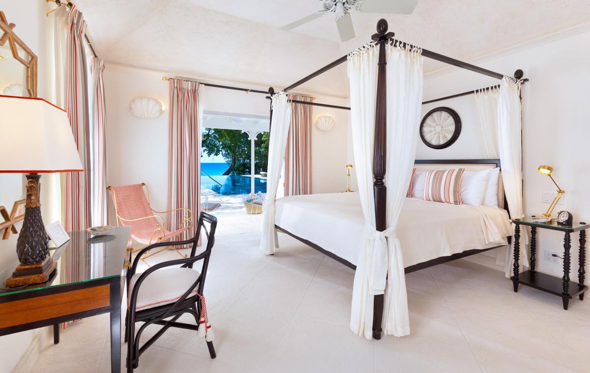 Bedroom 6 - Sunset South Room: king bed with a view of the infiity pool through to the Caribbean Sea, walk-through dressing room to ensuite bathroom with open air shower and double marble vanity. This suite connects to Sunset North Room.