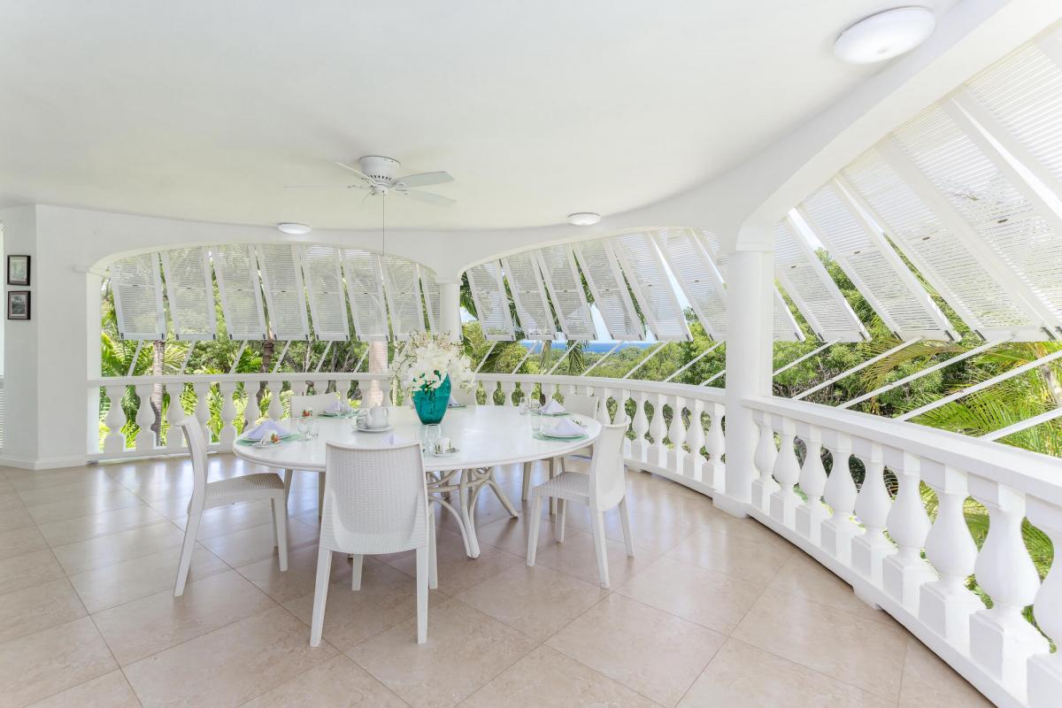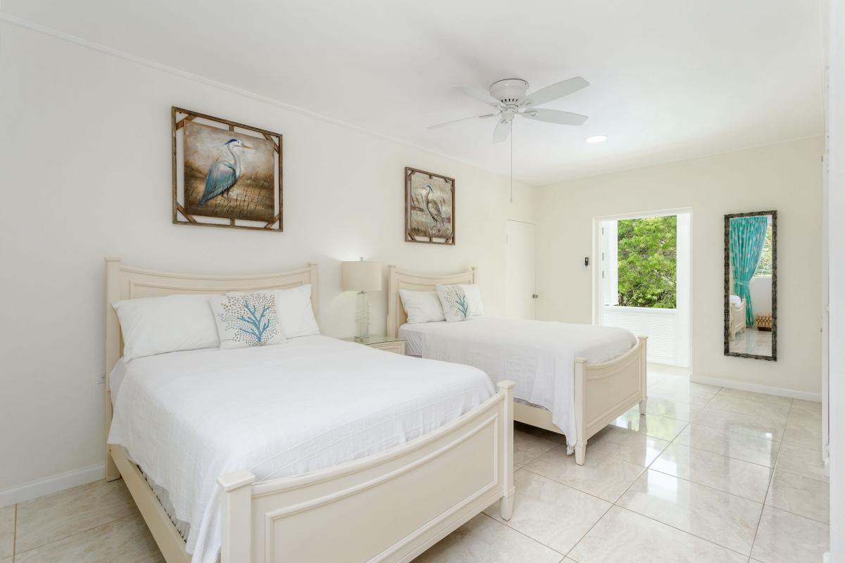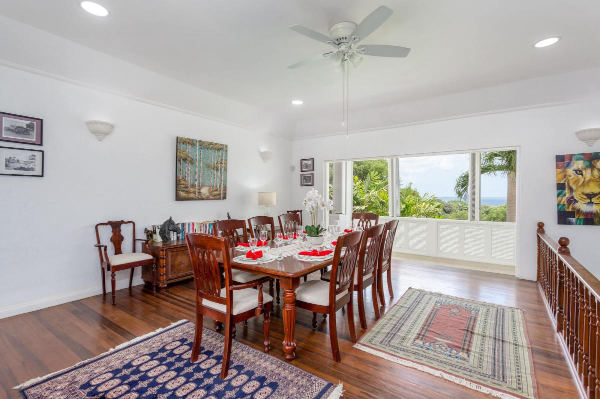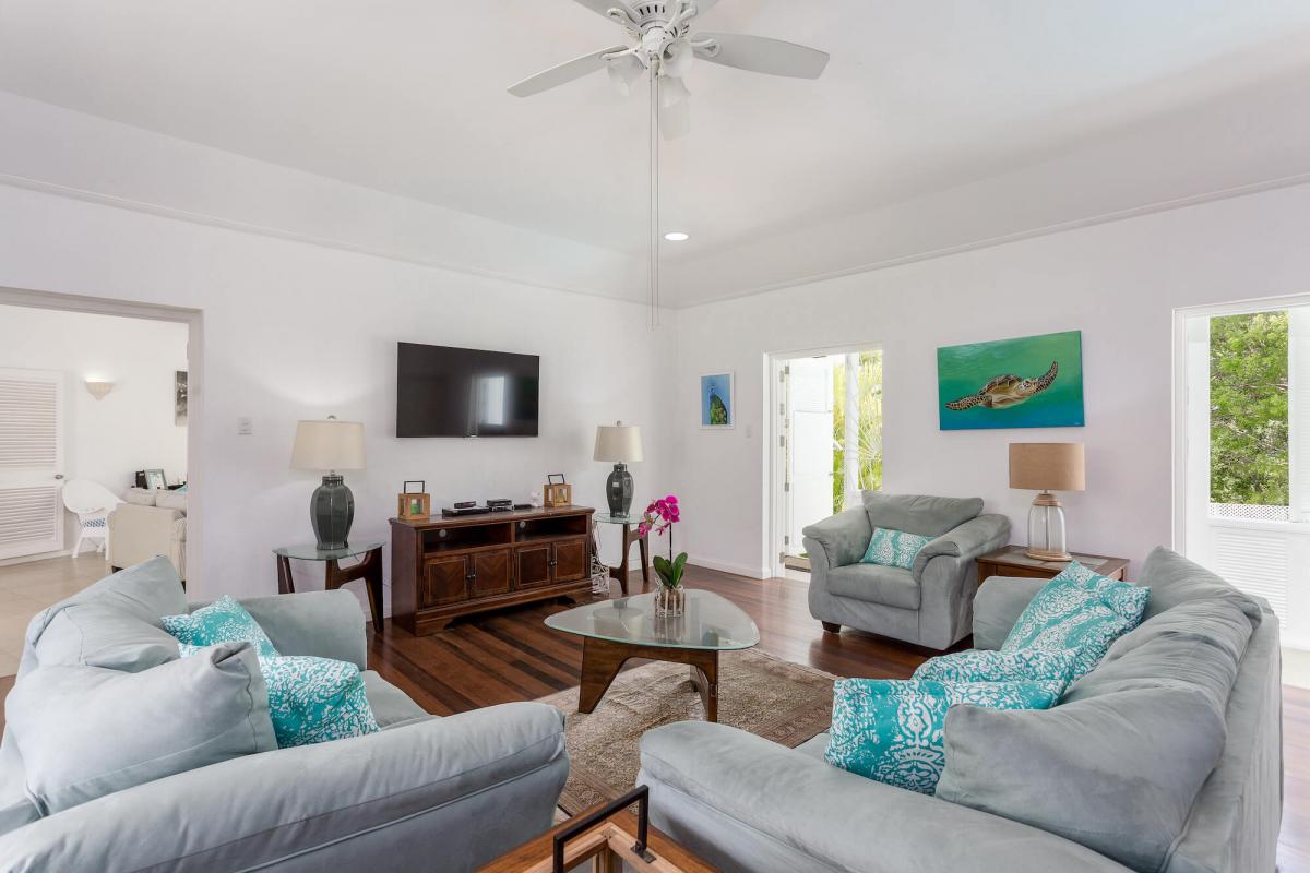 Halle Rose has over 6,000 square feet of covered living area and sits on more than two and a half acres, making it an excellent spot for relaxation and socialization. The villa has breathtaking sea views to the west, surrounded by majestic mahogany trees. To the south and east lies the Old Nine golf course, equipped with a clubhouse, bar, and tennis facilities. The entrance of Halle Rose welcomes guests to an elegantly furnished reception area that flows to the dining terrace that overlooks the pool and gardens. The dining terrace connects to the bedroom wings through an open corridor. To the right of the reception room is a family room that offers a casual space for relaxation. A formal dining room also connects to a fully equipped kitchen with a dumbwaiter for easy food delivery. The main level also houses a gym and a guest cottage with two bedrooms, a bathroom, living areas, and its entrance for extra privacy. The north hallway leads guests to the coral stone deck and pool area, which features sun loungers and umbrellas and connects to two of the spacious bedrooms. The south hallway leads guests to another bedroom and the primary bedroom suite.