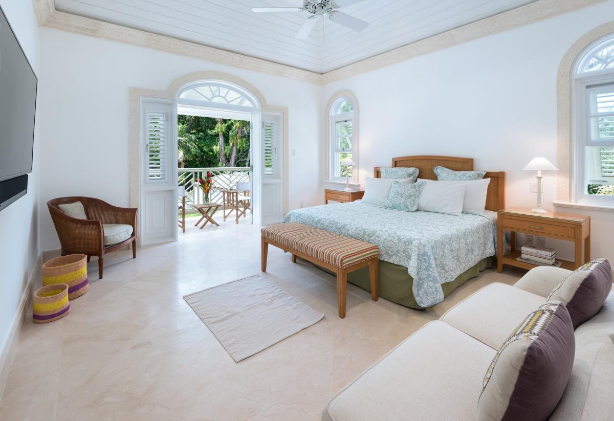 Three bedrooms are located on the first floor while the master suite is hosted on the entire upper level with views of the sea. This bedroom features a walk-in dressing room and study. The master opens to a private wrap-around balcony overlooking the ocean, bay, and pool. The master bath incorporates marble flooring with wood enclosed bath and his and her vanities.