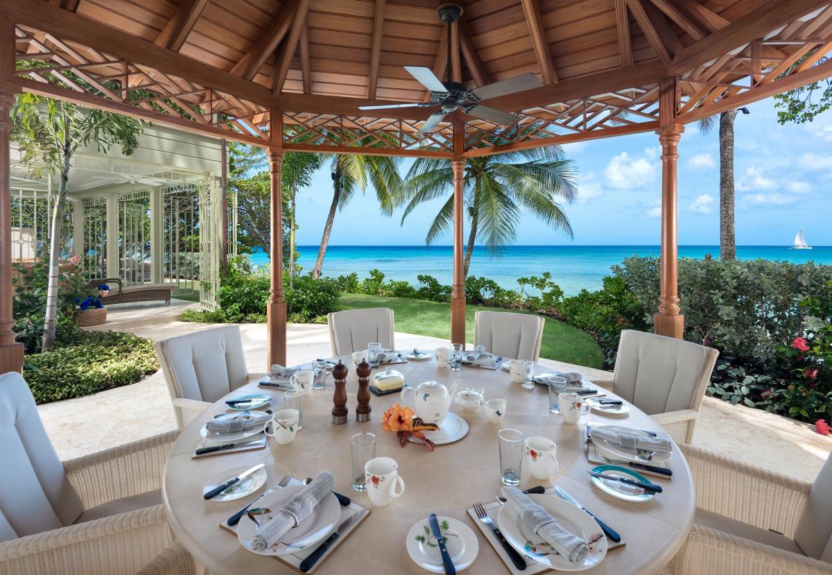 Guests will enjoy the oceanfront gazebo with alfresco marble dining table sitting just adjacent to the lagoon-style pool. Both are located in a trimmed garden with outdoor candelabra creating a chic relaxed setting.
