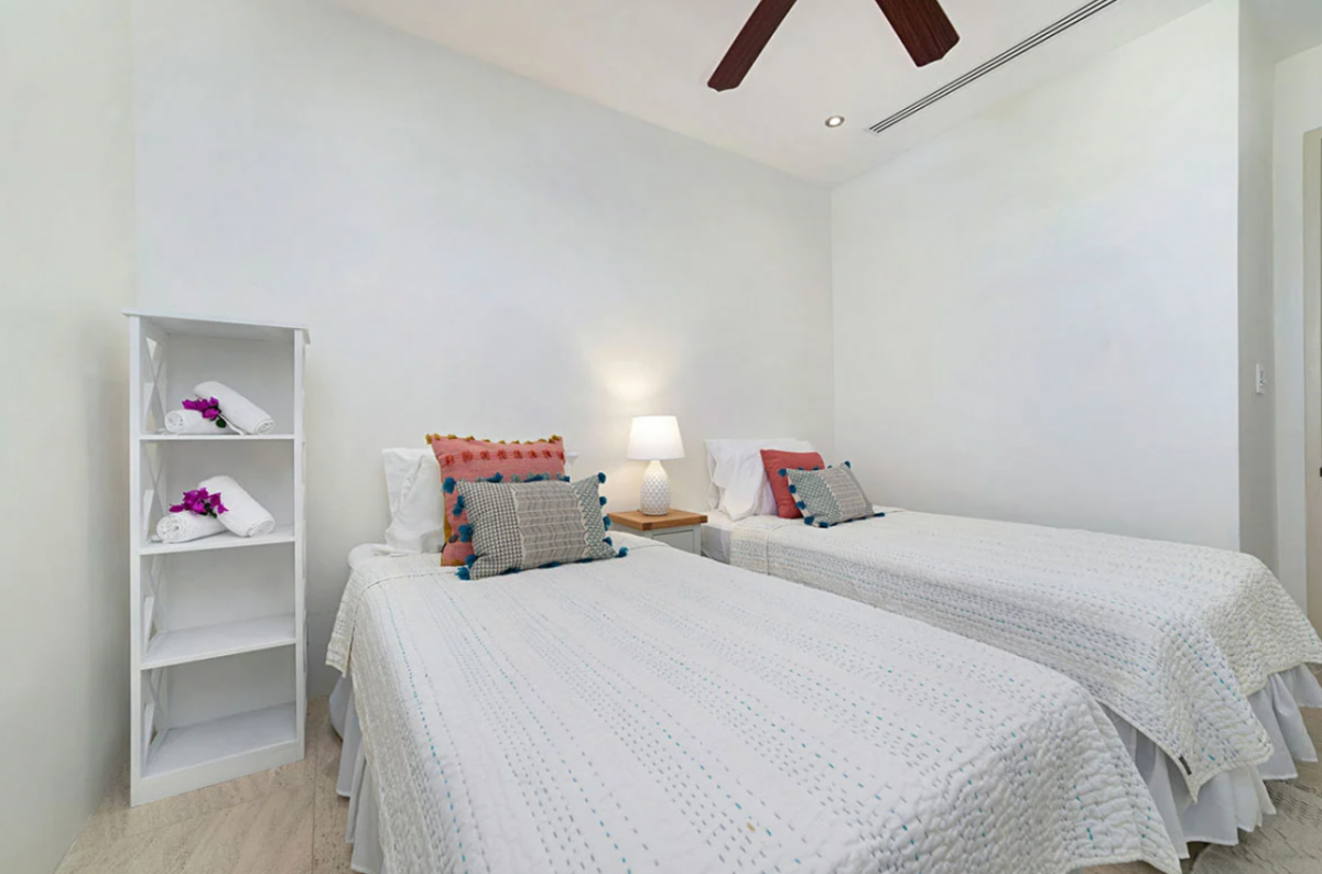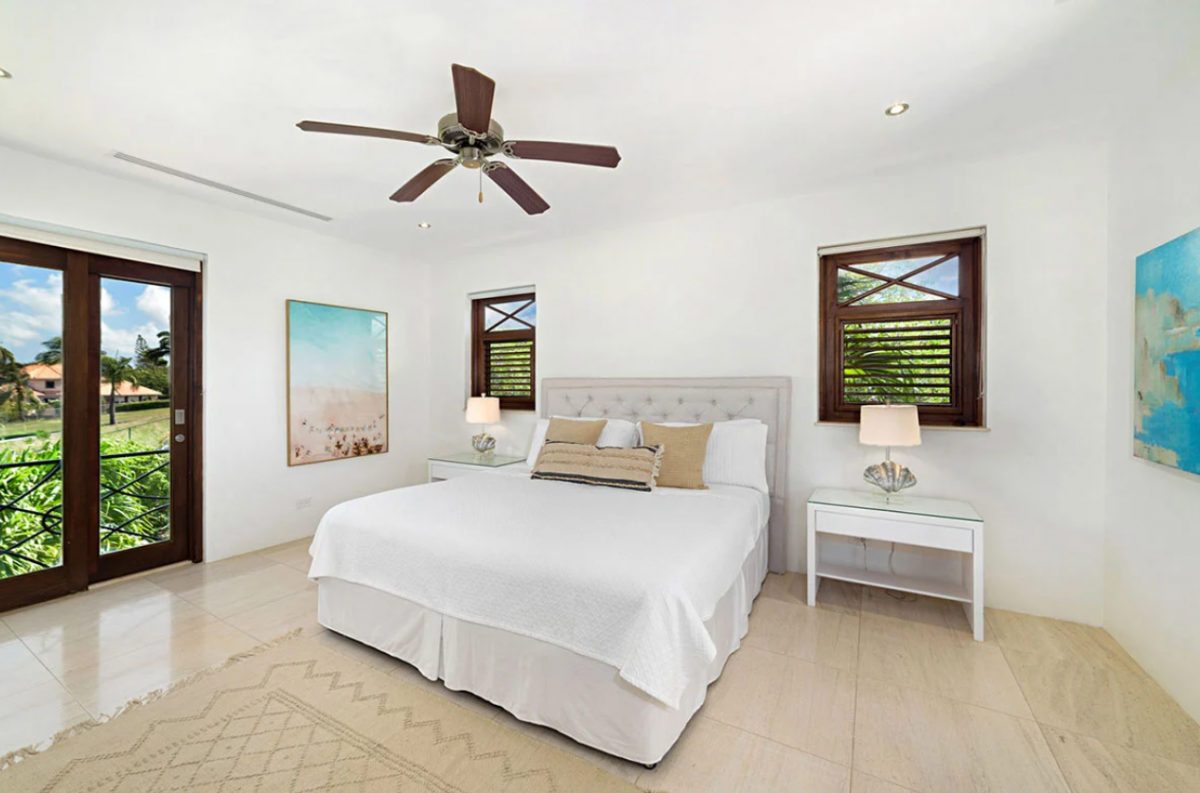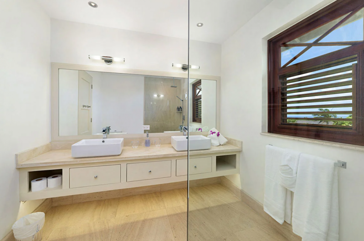 This Barbados villla rental, spread over various elevations, features eight bedrooms, making it an ideal choice for business retreats or group vacations. The south wing on the upper floor houses two bedrooms, each with ensuite bathrooms. Similarly, the north wing is composed of two bedrooms with ensuite baths as well. The ground floor is home to the main bedroom with an ensuite bath, alongside another room with twin beds , complemented by a full bathroom in the nearby study. The basement apartment provides the remaining two bedrooms, one with a king bed and one with two single beds that can be combined to create a king.