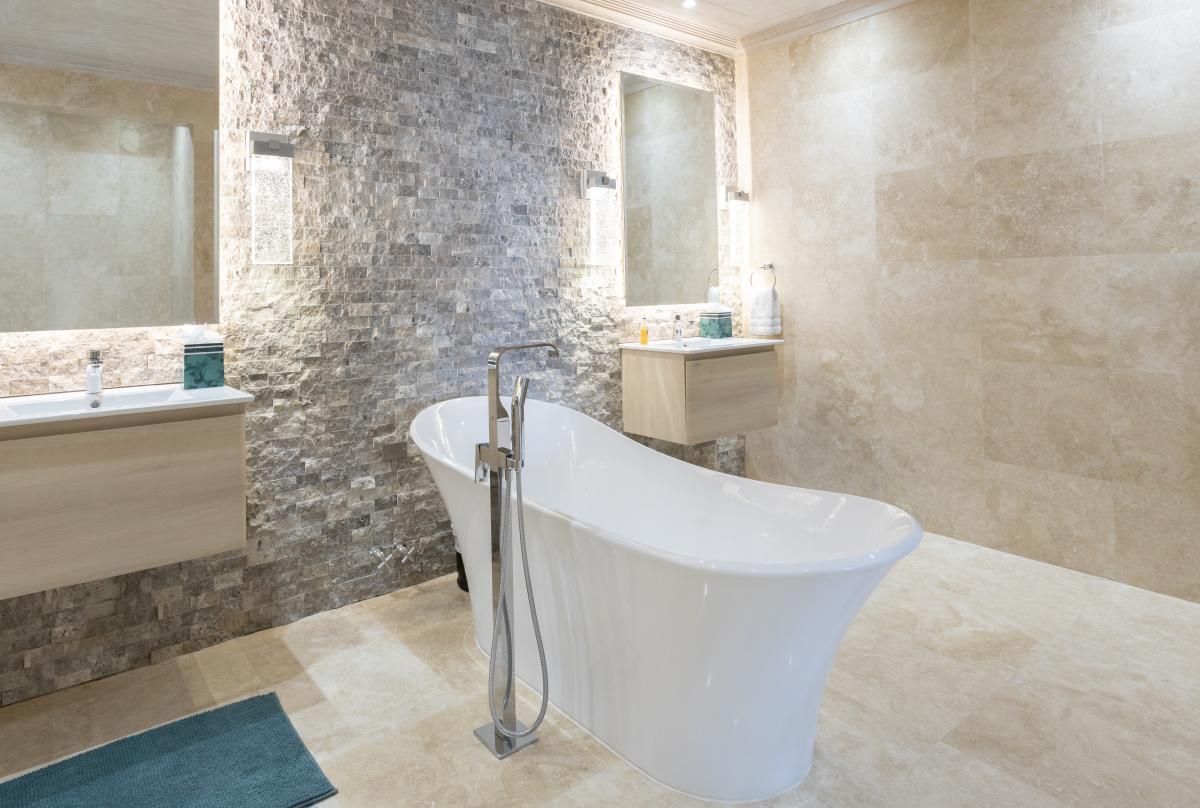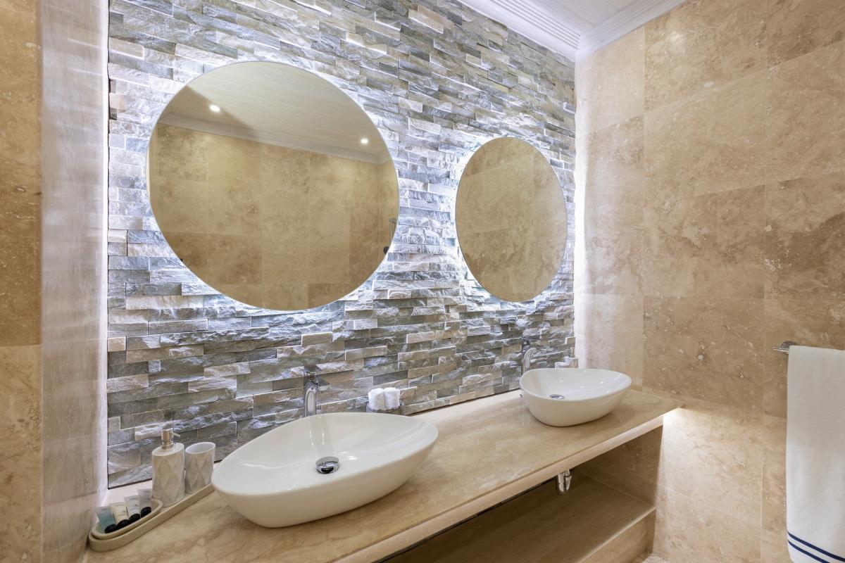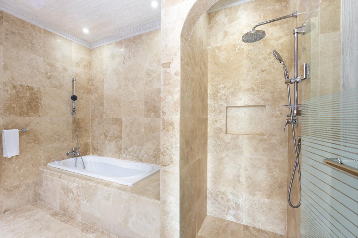 Primary Bedroom: This room is equipped with a king-sized bed, AC, a ceiling fan, Sonos System, a safe, a shared balcony, a walk-in wardrobe, a TV, and an ensuite bathroom with a freestanding bathtub, a walk-in shower, and twin vanities.