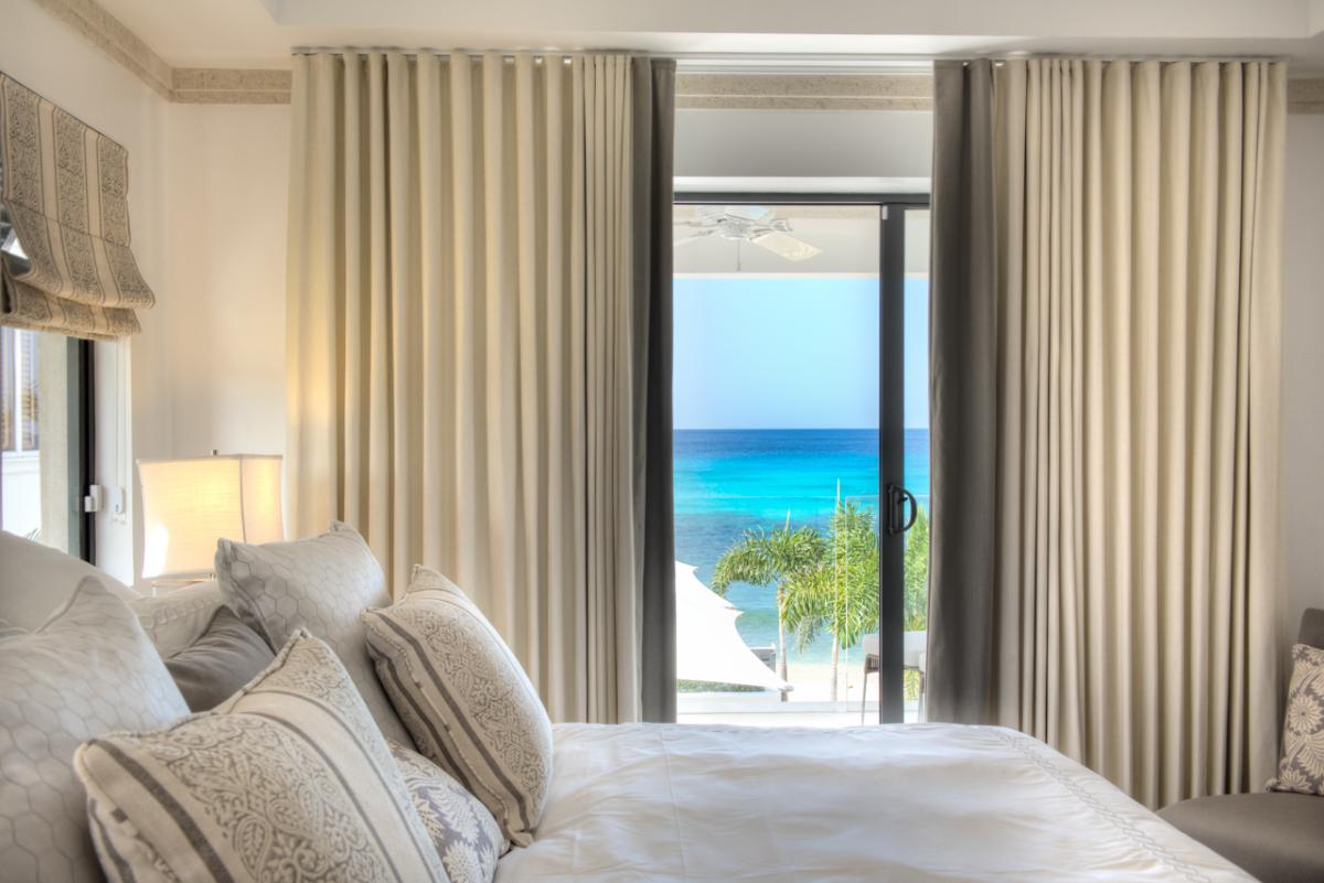 Bedroom 1: This room is equipped with a king-sized bed, AC, a ceiling fan, a TV, a walk-in wardrobe, a safe, a sea view, and an ensuite bathroom with a walk-in shower and a freestanding bathtub.