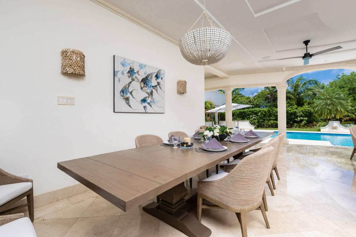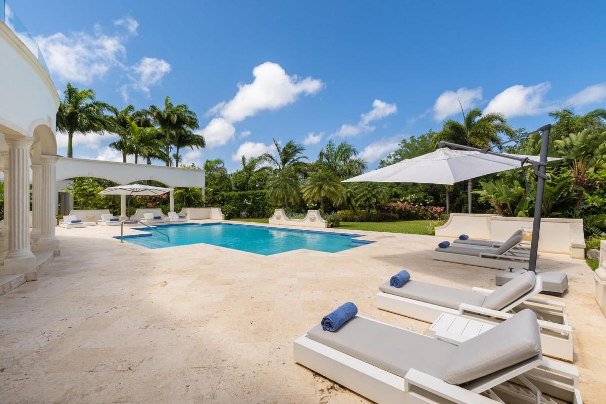 Outdoors, a private 50-foot swimming pool anchors the lush tropical gardens, surrounded by a covered terrace and elegant lounging areas perfect for both sun-soaked afternoons and intimate evening gatherings. An open-air bar, espresso station, BBQ area, and piano lounge create inviting spaces for entertaining, while the fully equipped kitchen and spacious dining area cater equally well to relaxed breakfasts or formal dinners.