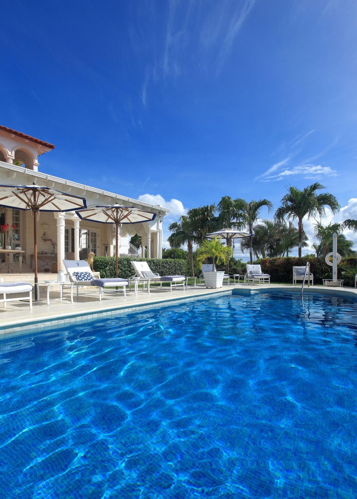 The covered patio, offering spectacular views of the swimming pool and well-manicured gardens, along with the dining area, wet bar and outdoor heated Jacuzzi render the outdoor living space as appealing as the villa's opulent interior, making Monkey Puzzle ideal for entertaining.