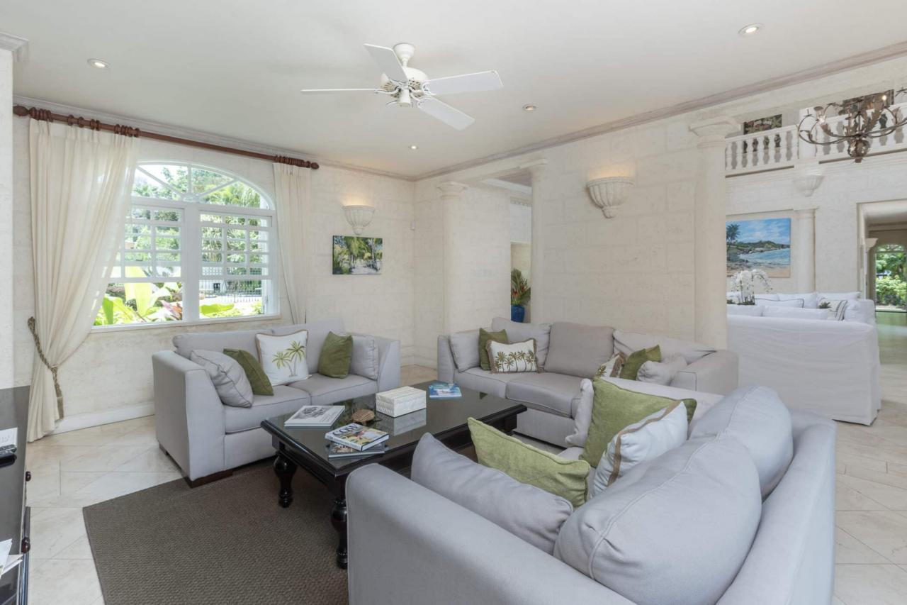 Designed around a central, airy atrium and seamlessly blending indoor and outdoor living, Saramanda has plenty of space for guests to simply relax and unwind; all of the living and dining rooms open out to the pool and garden. The large indoor living room features oversized comfortable sofas and French doors that open out on to a covered terrace with outdoor seating and an informal dining area. The laid-back media room, adjacent to the living room, features wide screen HDTV, cable and DVD and also opens out to the pool deck.