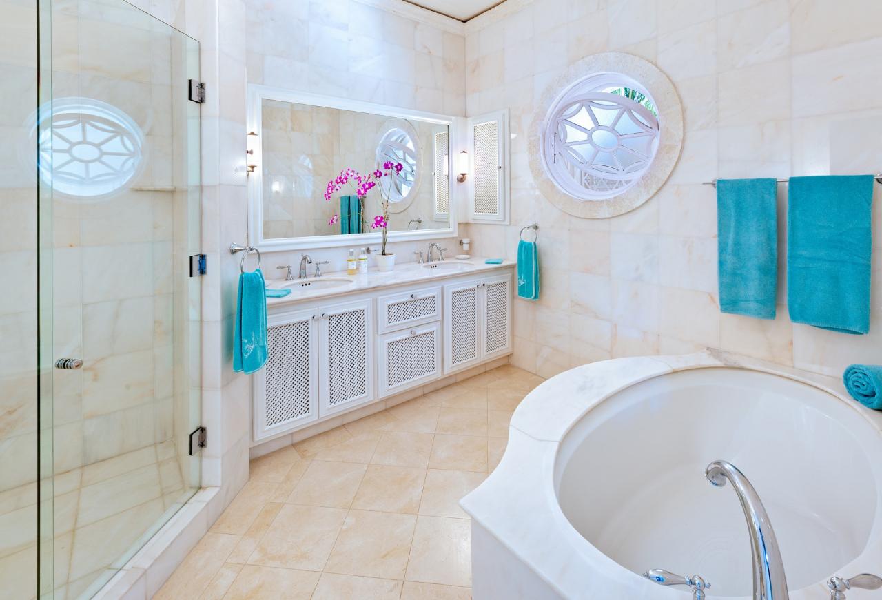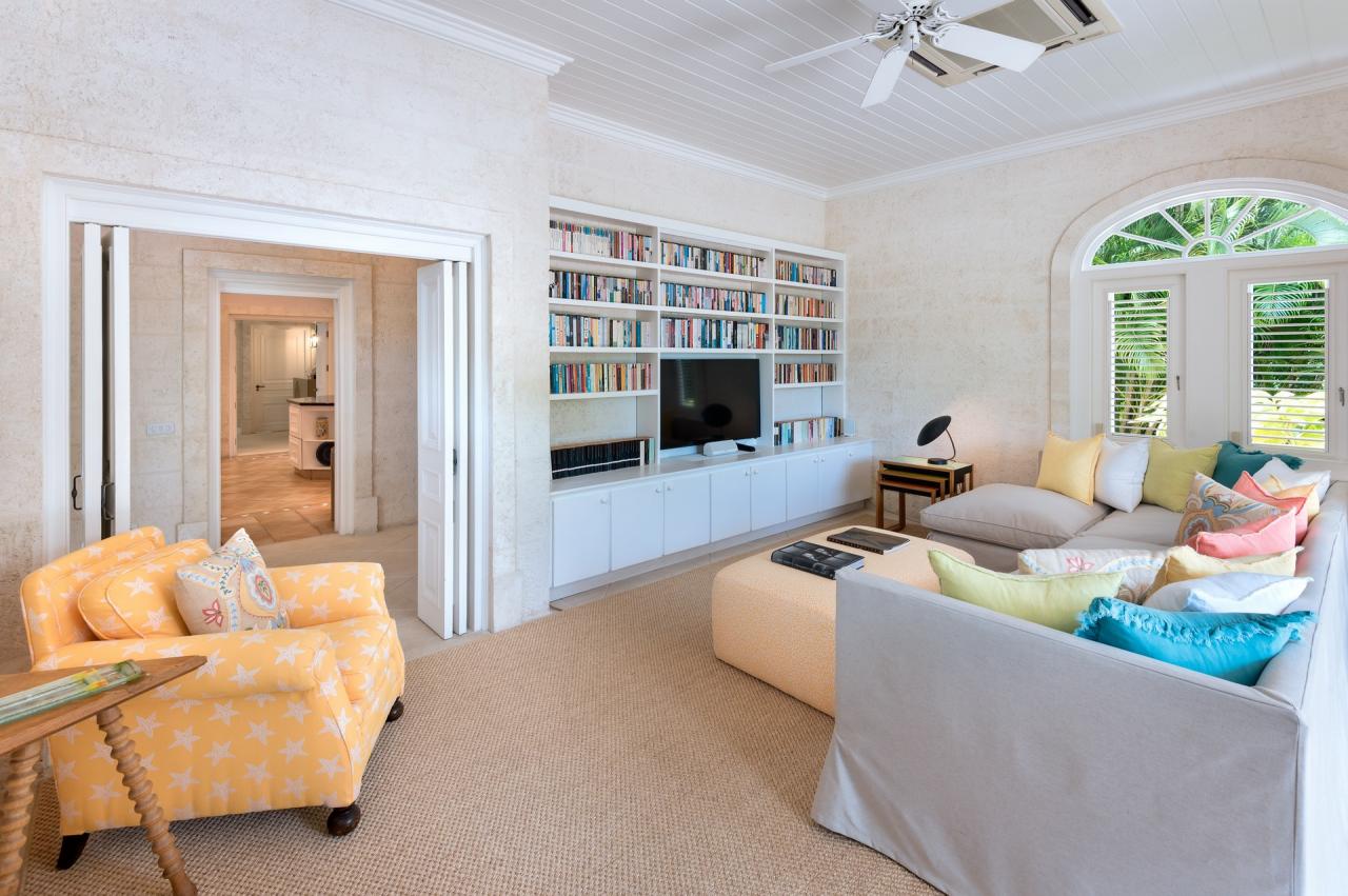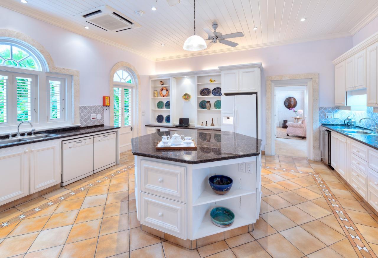 Villa Gardenia's open plan layout welcomes guests as soon as they enter. The foyer opens to an expansive living/dining room featuring coral stone pillars. Guests are then lead out to a large veranda that takes full advantage of the Caribbean sunlight and pictureesque views. Below, the first floor also opens to a terrace complete with wet bar and gazebo. This villa also features a family friendly media room and fitness room.
