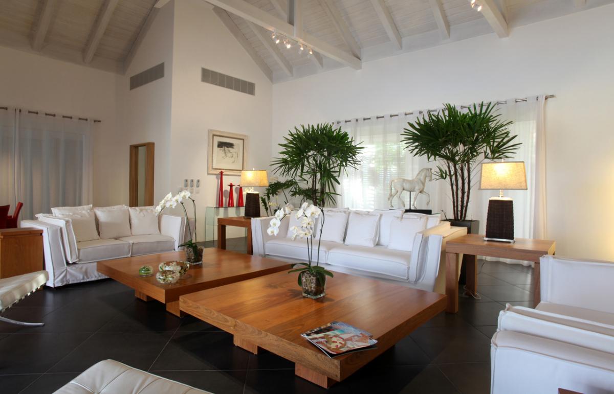 Villa Vogue at Casa de Campo is a spectacular one-story villa offering a warm and welcoming atmosphere. It articulates the ideals of contemporary architecture and design, with a hint of Asian influence. A wide driveway, studded with orchid laden palms, leads to the three-vehicle garage and the impressive entry. Inside, orchid gardens flank the front door in the breezy foyer and corridors on each side lead to the bedrooms.