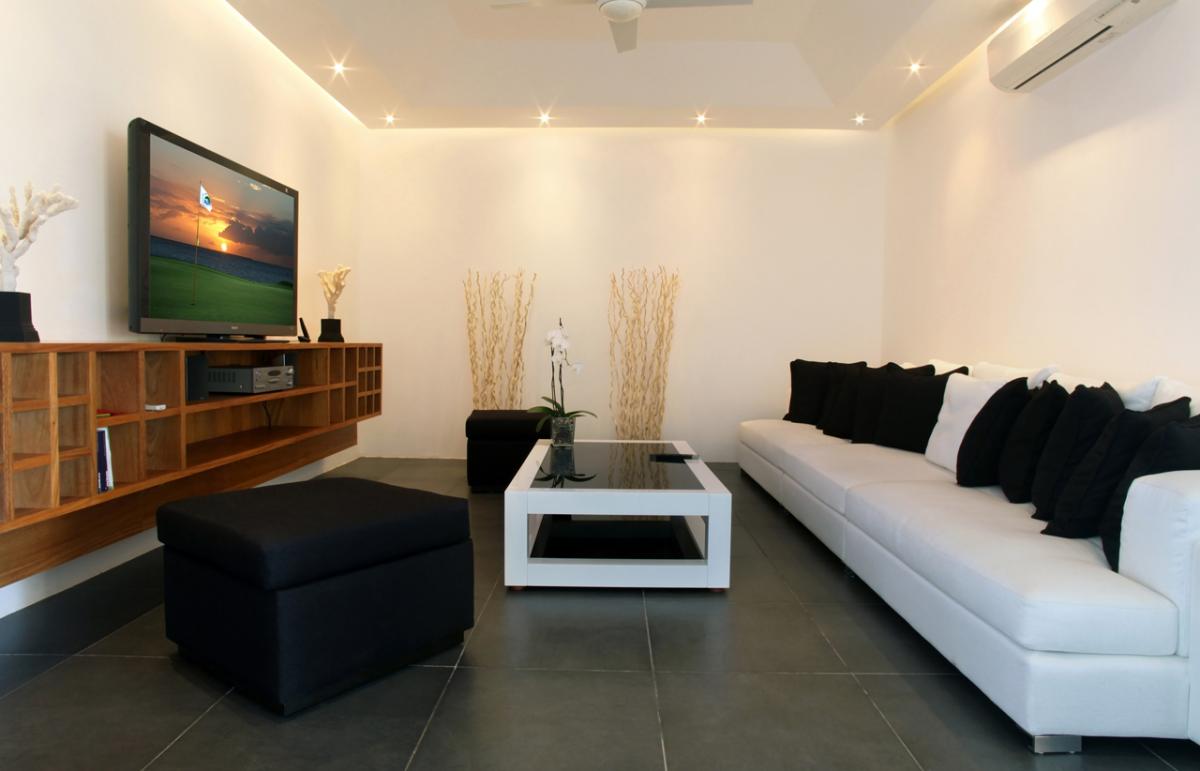 Entering the completely air-conditioned interiors, guests find an array of versatile settings for vacation living and entertaining; each realized with impeccable quality and style. In the formal living room, plump white sofas and loveseats contrast with teak tables while well-chosen accessories add character and color. A table in one corner is perfect for snacks or games. The family room includes a large-screen plasma television and a long couch to kick back and enjoy sports or keep up with the news. The formal dining room features two side-by-side square tables, each seating eight. In the professional-level kitchen, a center island with cook top, separate oven, and double refrigerator are among the many highlights.