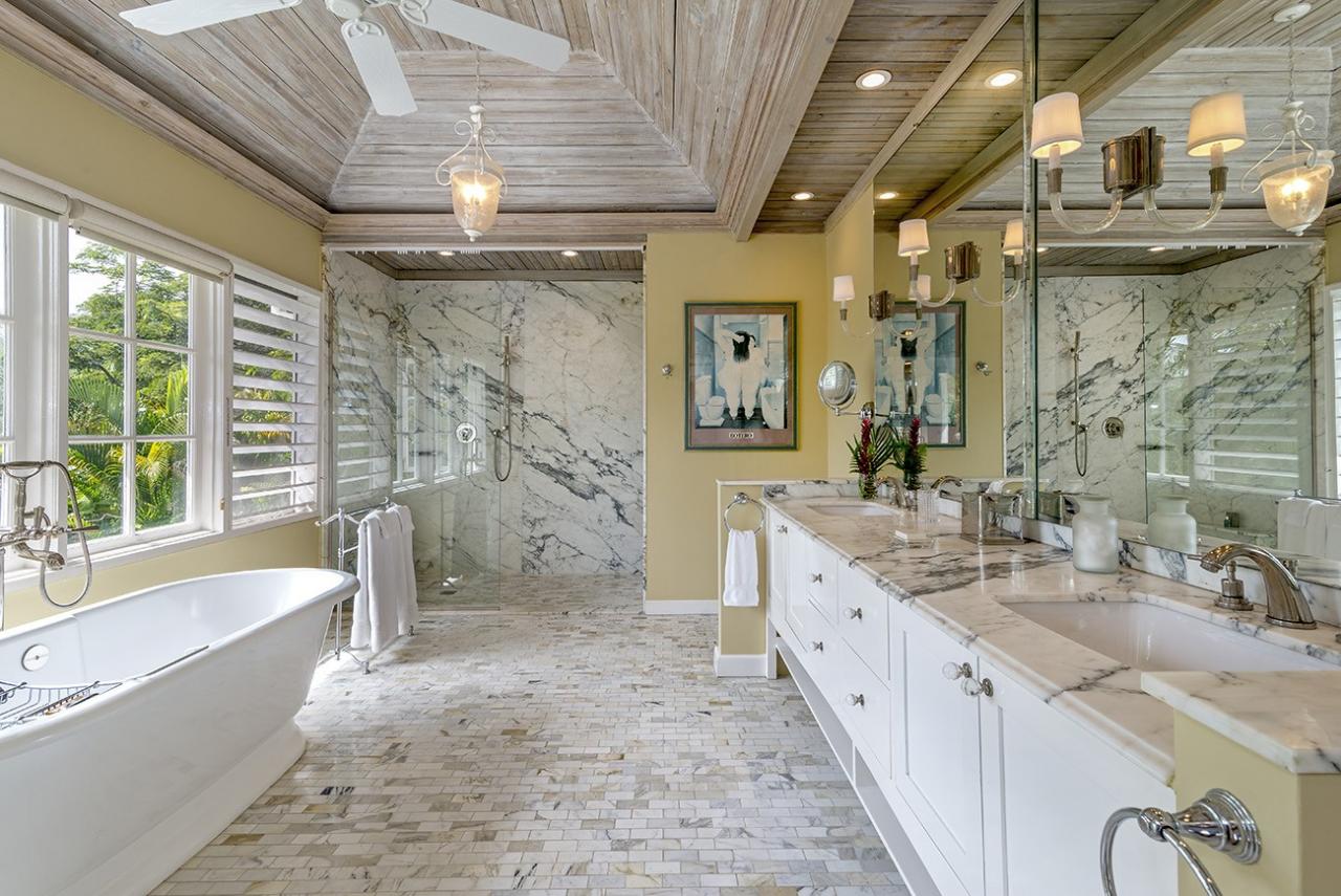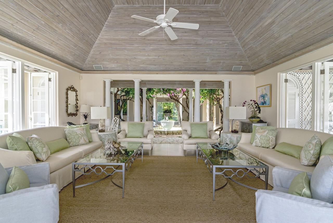 From the Great Room, 18 French doors open to 1,400 square feet of furnished verandahs. Deep cushions cover sofas, chairs, chaises and a wonderful bamboo swing. The view is spectacular day and night. Just beyond the verandah, the private pool spans the front of the house. Adjacent to the pool are the outdoor wet bar and shower and the cutest little powder room in Jamaica.