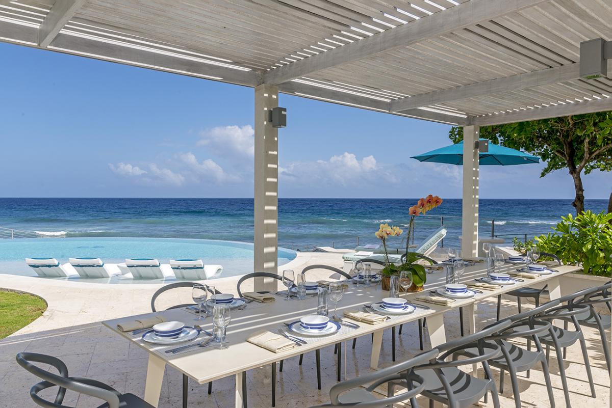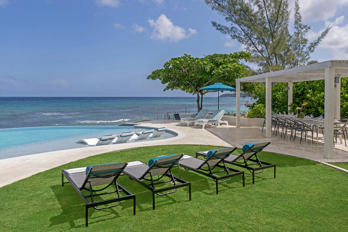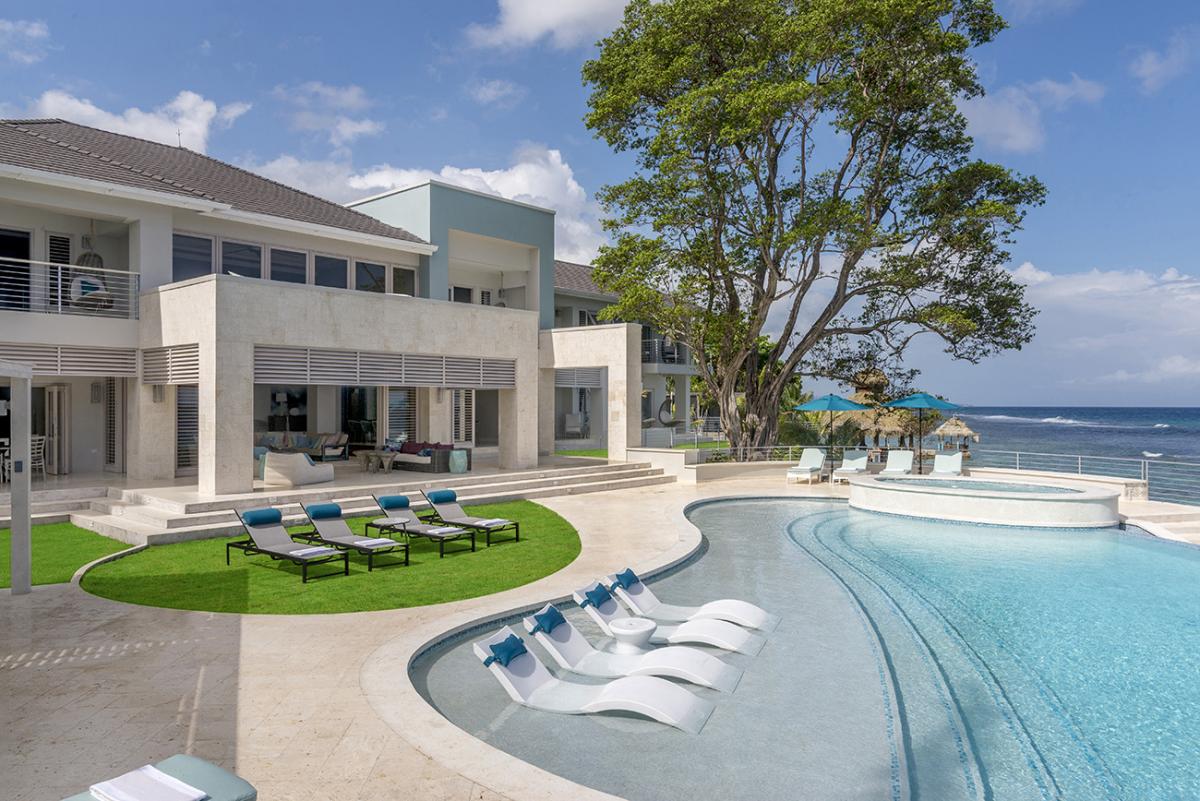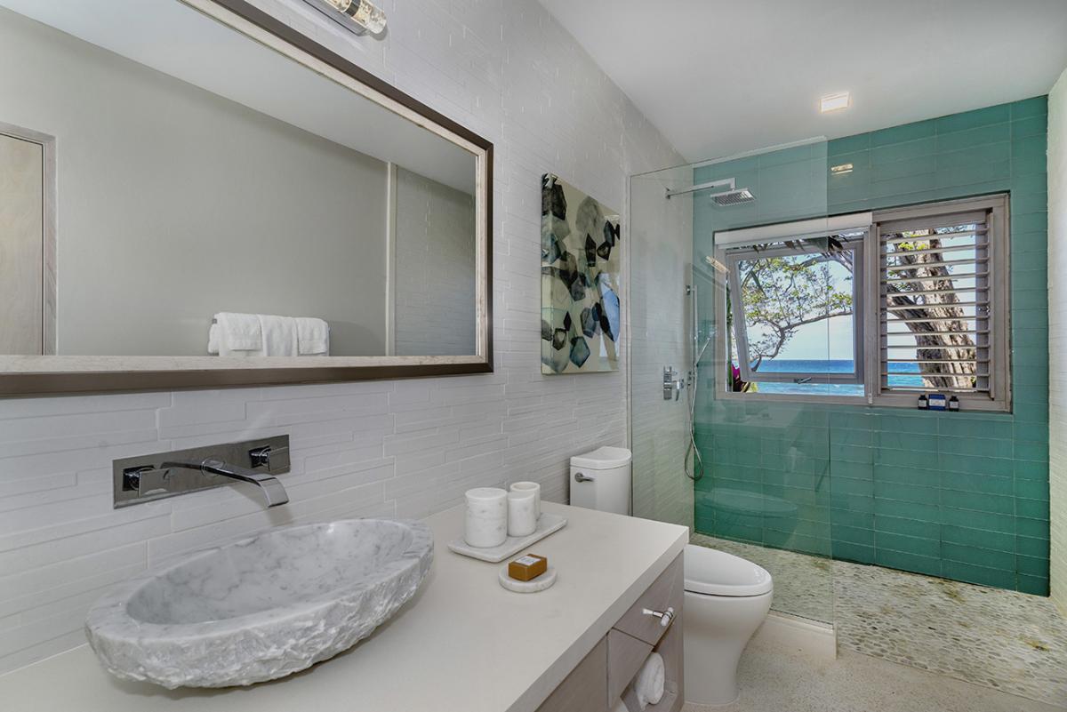 Buttonwood Reef is a gorgeous Jamaica vacation rental. This new villa faces the ocean and is the epitome of ocean edge living. The first moment guests enter the villa through the dramatic Jequitiba wood ceiling entranceway and oversized pivot door, their eyes meet the Caribbean Sea. Buttonwood Reef has an excellent collection of artisan pieces that represent the best Jamaican artists, including Dougall, Mara Made, Pinto Pottery, and Dready Art.