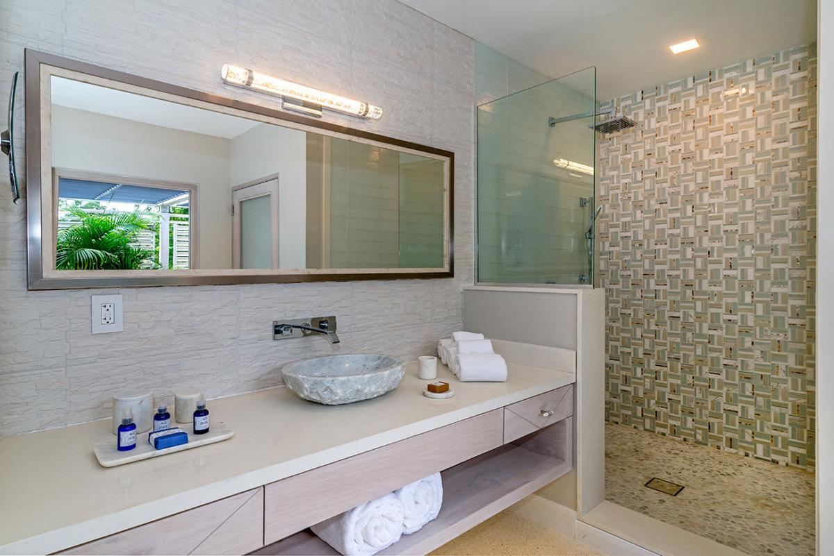 Buttonwood Reef has excellent outdoor living areas equipped with a shallow entry infinity-edge pool with a Baja ledge with sun shelves and a hot tub large enough for 14 guests. The Almond Tree terrace is a shaded terrace with a barbeque and overlooks the sandy beach area to the east. The other outdoor attractions include a lower deck with sun loungers, a three-pin putting green, and many other places for guests to enjoy the peace and tranquility of the property. Next door to Buttonwood Reef, through a gate, there is a small sandy beach of Hermosa Cove Boutique Resort, and beyond is the calm, reef-protected bay, which is perfect for swimming.