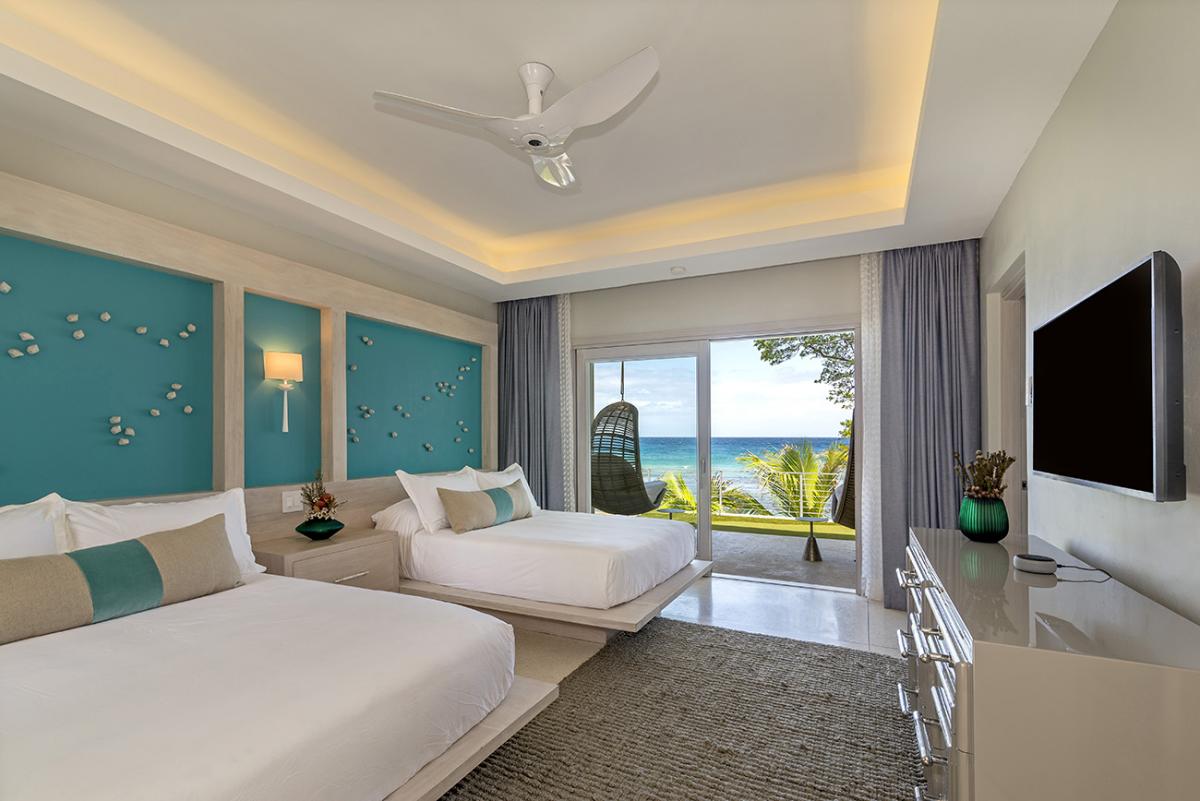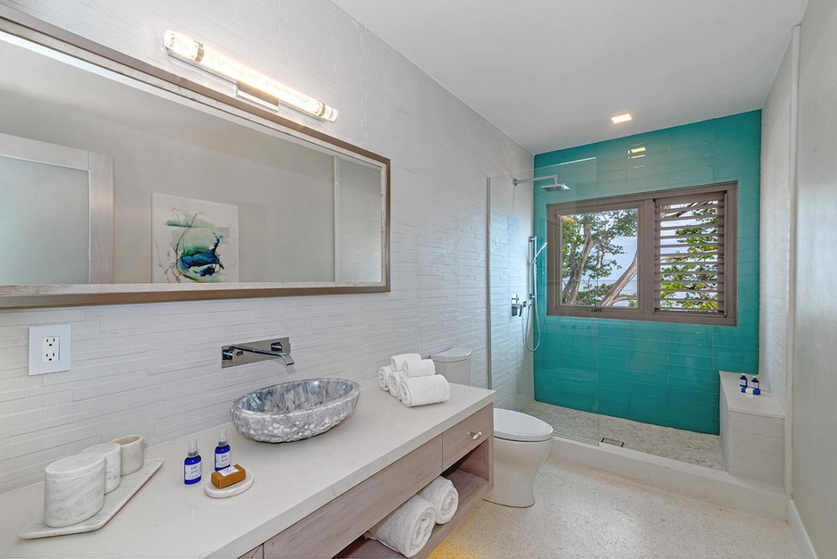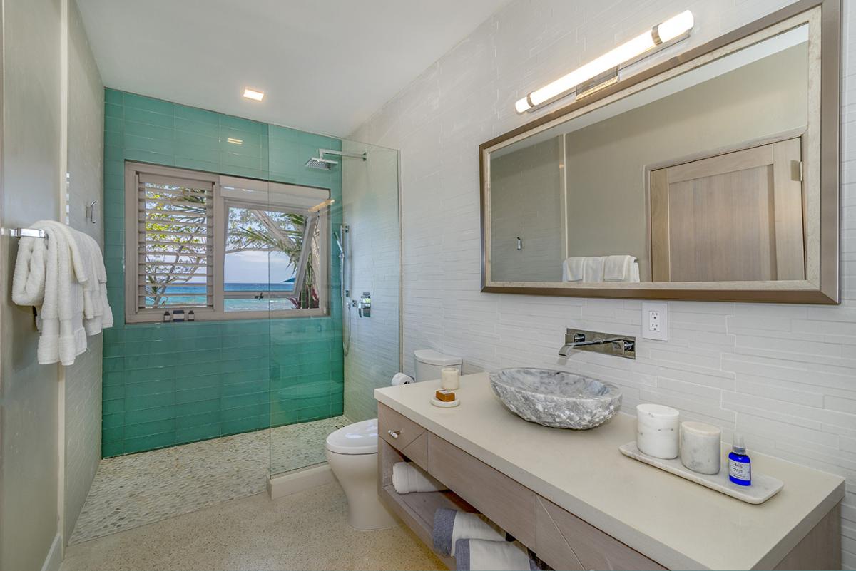 Bedroom 4 (Sea Foam): This room is equipped with a king-sized bed, air conditioning, a ceiling fan, a flat-screen SMART TV, and an ensuite bathroom with a single vanity, walk-in rain shower, robes, and a personal safe. Sea Foam also opens to an ocean-facing balcony.