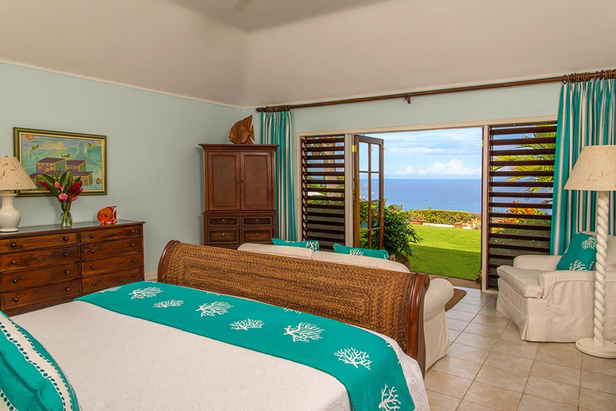 Bedroom 5: King bed, covered porch, hillside and ocean view, large en suite bathroom with jacuzzi tub and glass-walled walk-in shower