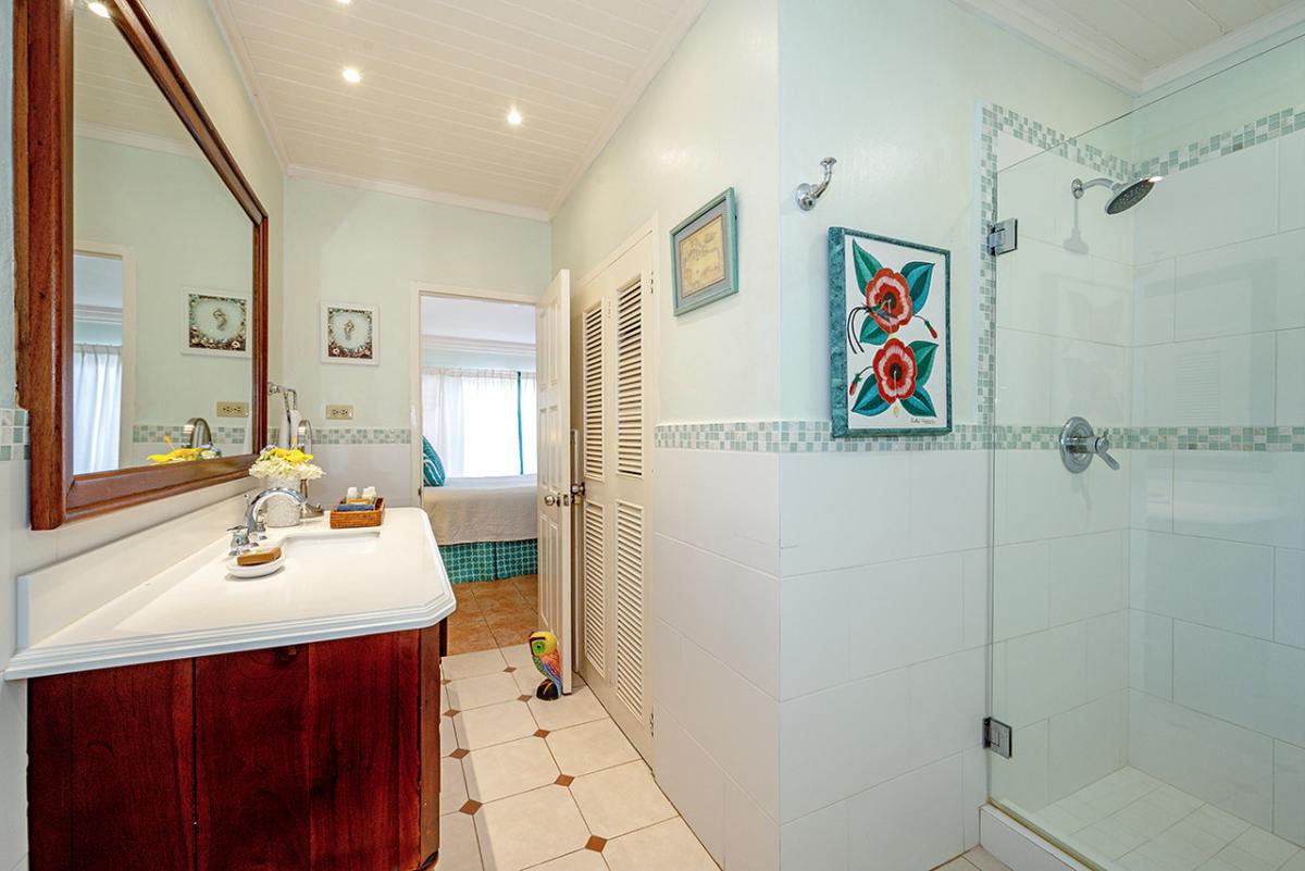 Bedroom 2: Queen mahogany bed, terrace, ocean view, en suite bathroom with large walk-in shower, french doors to interior garden, adjoining passageway with bedroom 3