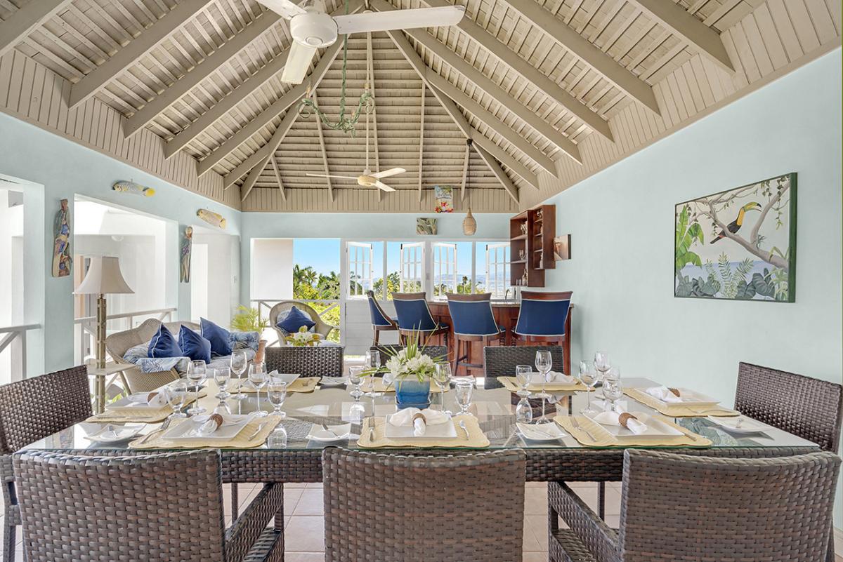 The central part of the villa is the large living room with high rafter-and-beam ceiling. This space opens wide to a wrap-around verandah that captures the breathtaking view and refreshing tradewinds.