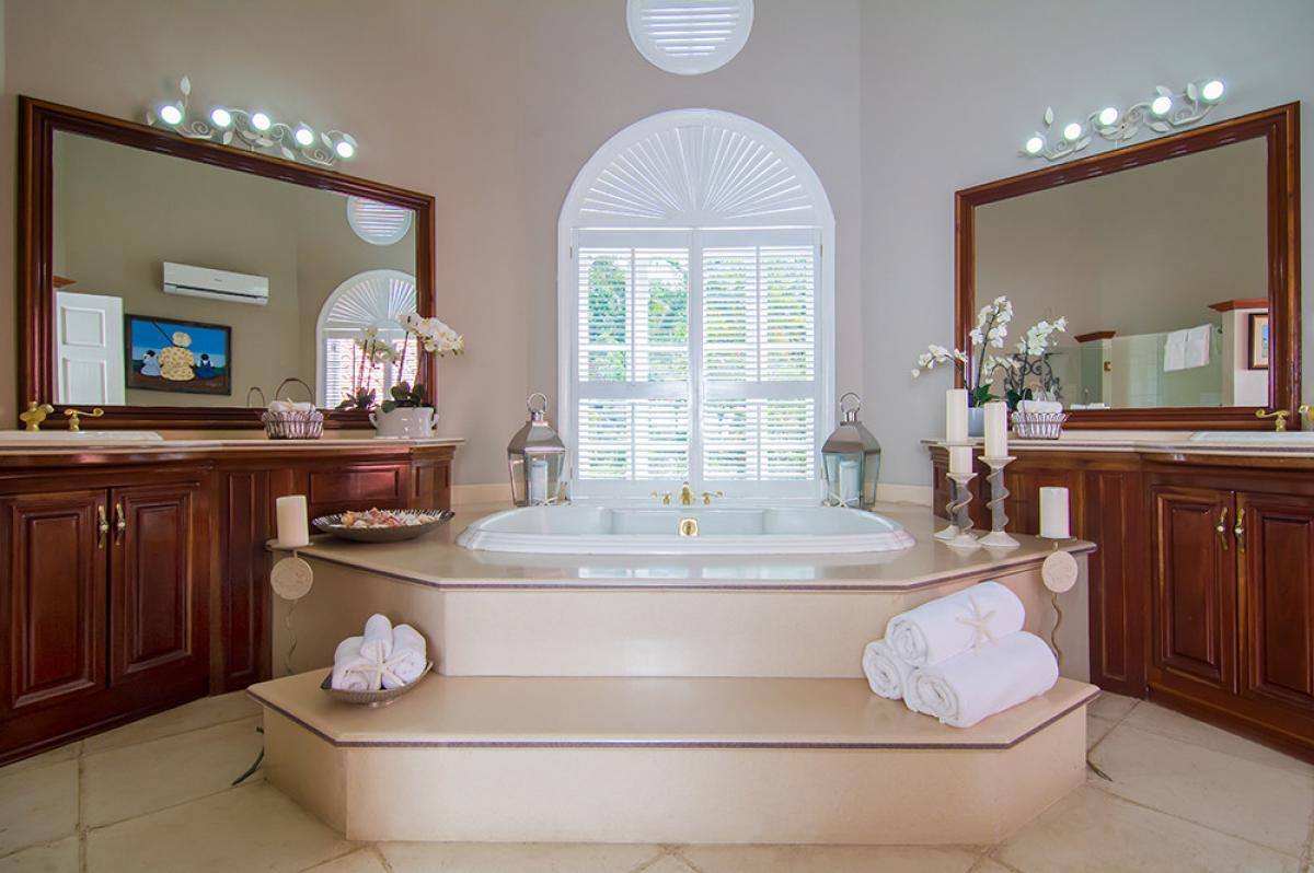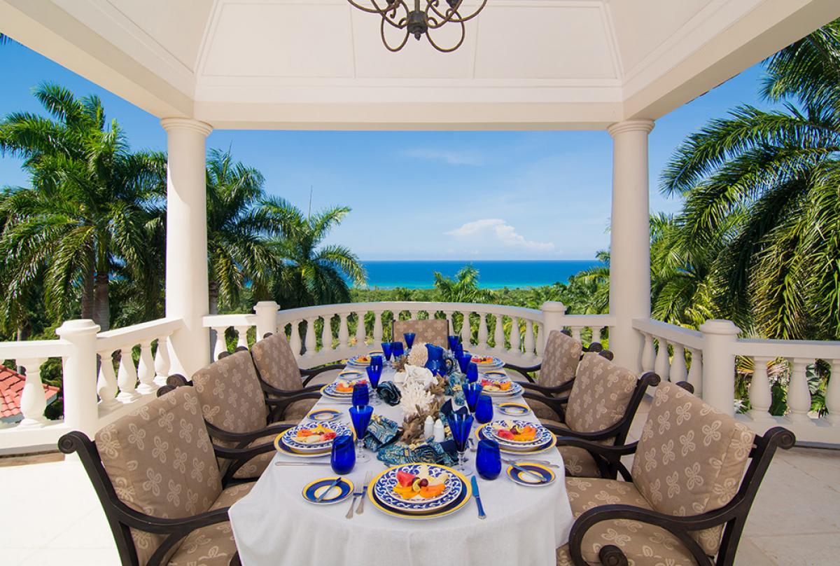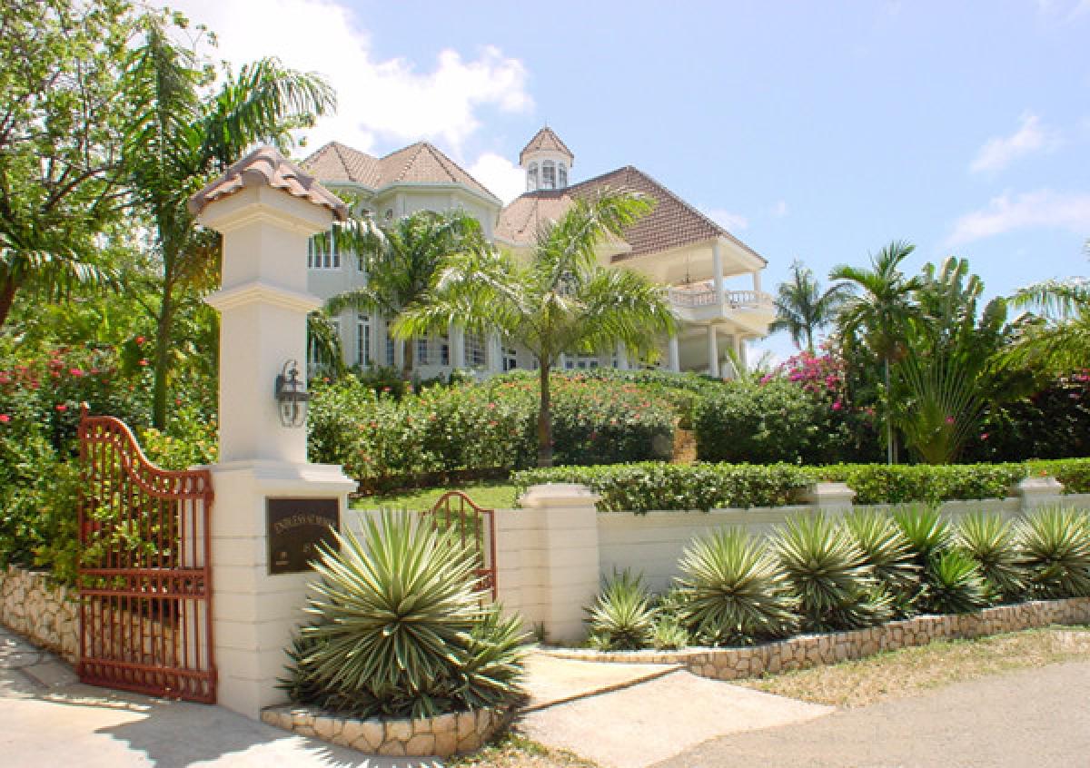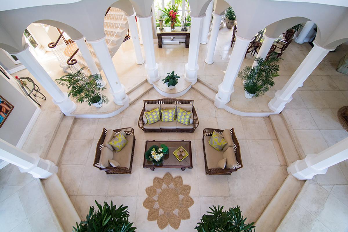 Endless Summer is a turreted mansion with views of the Caribbean Sea. From the porte-cochere, beveled glass doors open to a dramatic 80' columned space. A sweeping white stone staircase curves gracefully from the foyer to a balustraded gallery encircling and overlooking the sunken living room ... topped high above by the dome of this home's highest turret. From the gallery, as from all bedrooms, a wall of glass doors opens to the deep wrap-around porch and panoramic vistas over the golf course and the turquoise waters outlining the horizon.