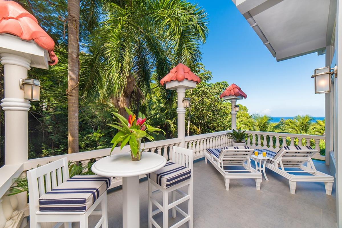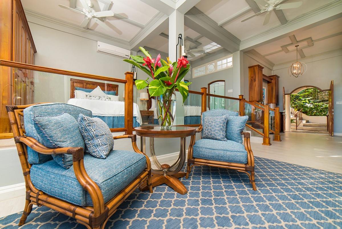 Bedroom 2: This room is located upstairs. Bedroom 2 is equipped with a queen-sized bed, a flat-screen television, and an ensuite bathroom with a tub/shower combination. Bedroom 2 also has glass doors to a furnished balcony with an ocean view and a connecting door to Bedroom 3.