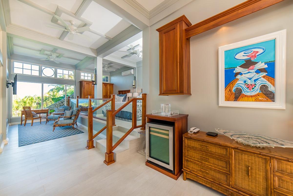 Primary Bedroom: This room is located upstairs. The Primary Bedroom is equipped with a king-sized bed, a flat-screen television, and an ensuite bathroom with a whirlpool tub and a walk-in shower. The Primary Bedroom also has glass doors to a private furnished balcony with an ocean view.