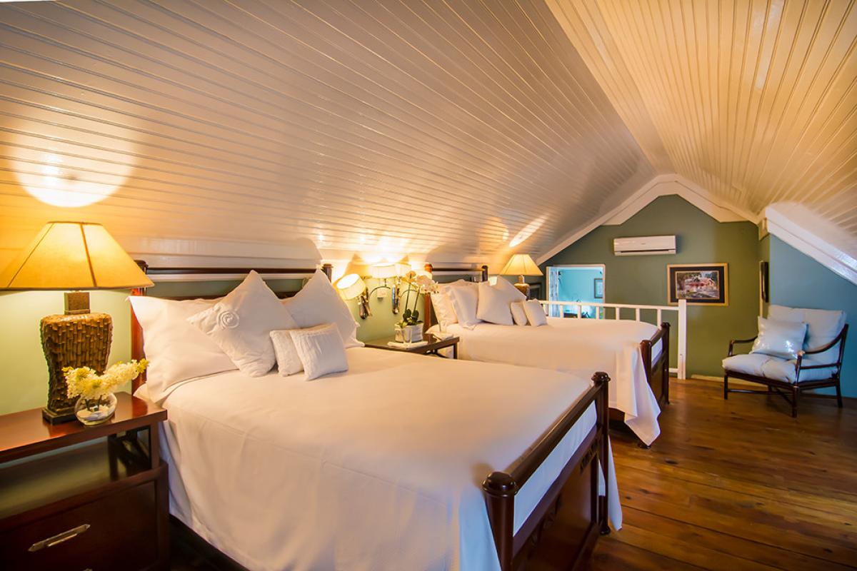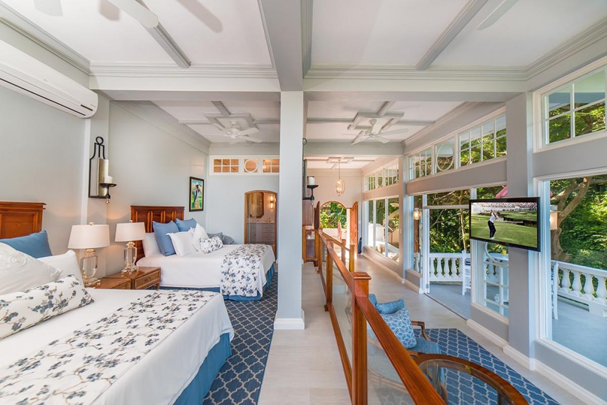 Bedroom 7: This room is located downstairs. Bedroom 7 is equipped with two queen-sized beds, a sitting room with a balcony, and an ensuite bathroom.