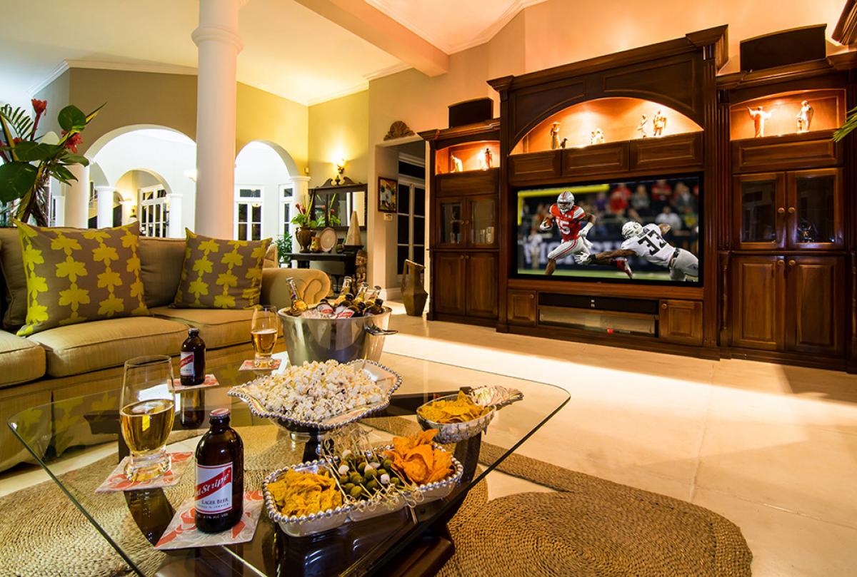 Interiors are designed against a clean backdrop of mushroom-colored walls crisply trimmed in white. Mediterranean-style floors, smooth as marble underfoot, were custom made on site, creating an overall palate of soft minimalist colors. On fine Lenox china, dinners are served in the downstairs dining alcove, north verandah or on the upstairs balcony as the sun sets over the sea. Strategically-placed Bose speakers create surround-sound in the villa, verandahs, balconies and pool area.