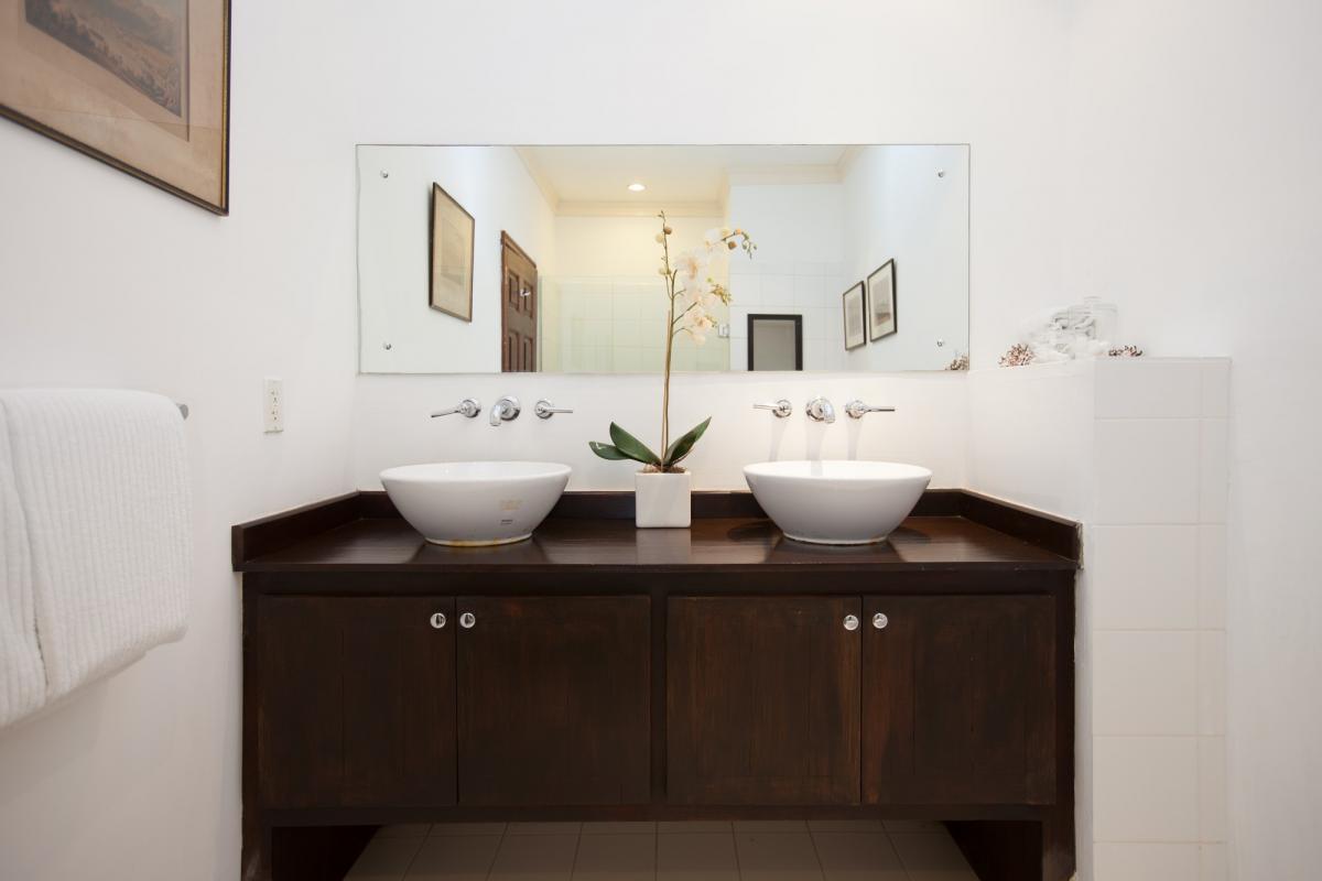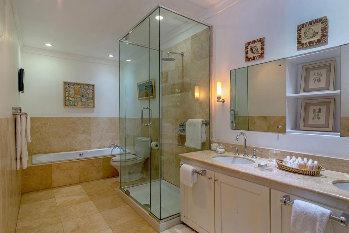 Bedroom 5: This room is located upstairs and is equipped with an optional king-sized bed or twin-sized beds, blackout curtains, remote-controlled quiet air conditioning, and an ensuite bathroom with a double-basin marble vanity and a walk-in shower. Bedroom 5 also overlooks the beach and the ocean.
