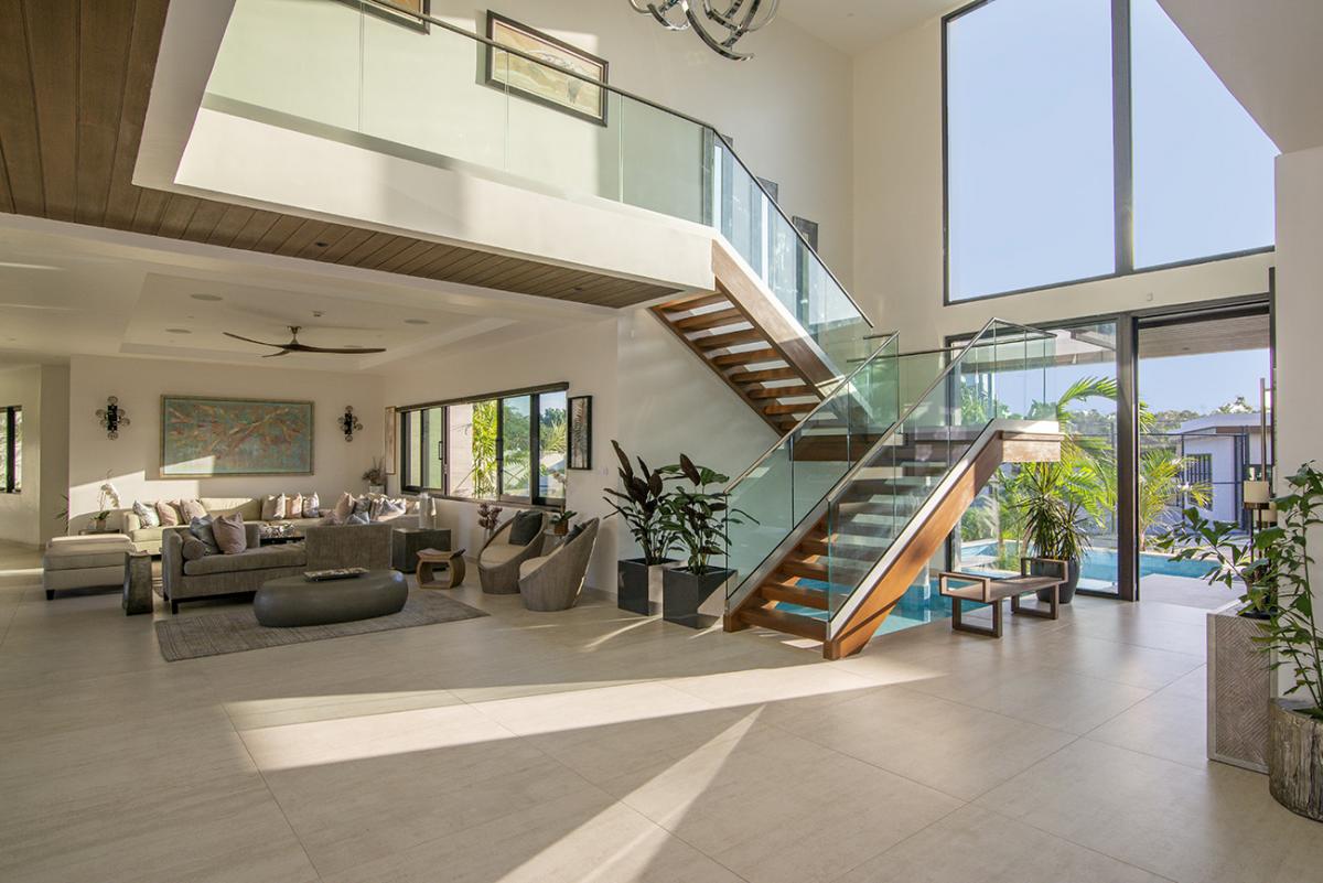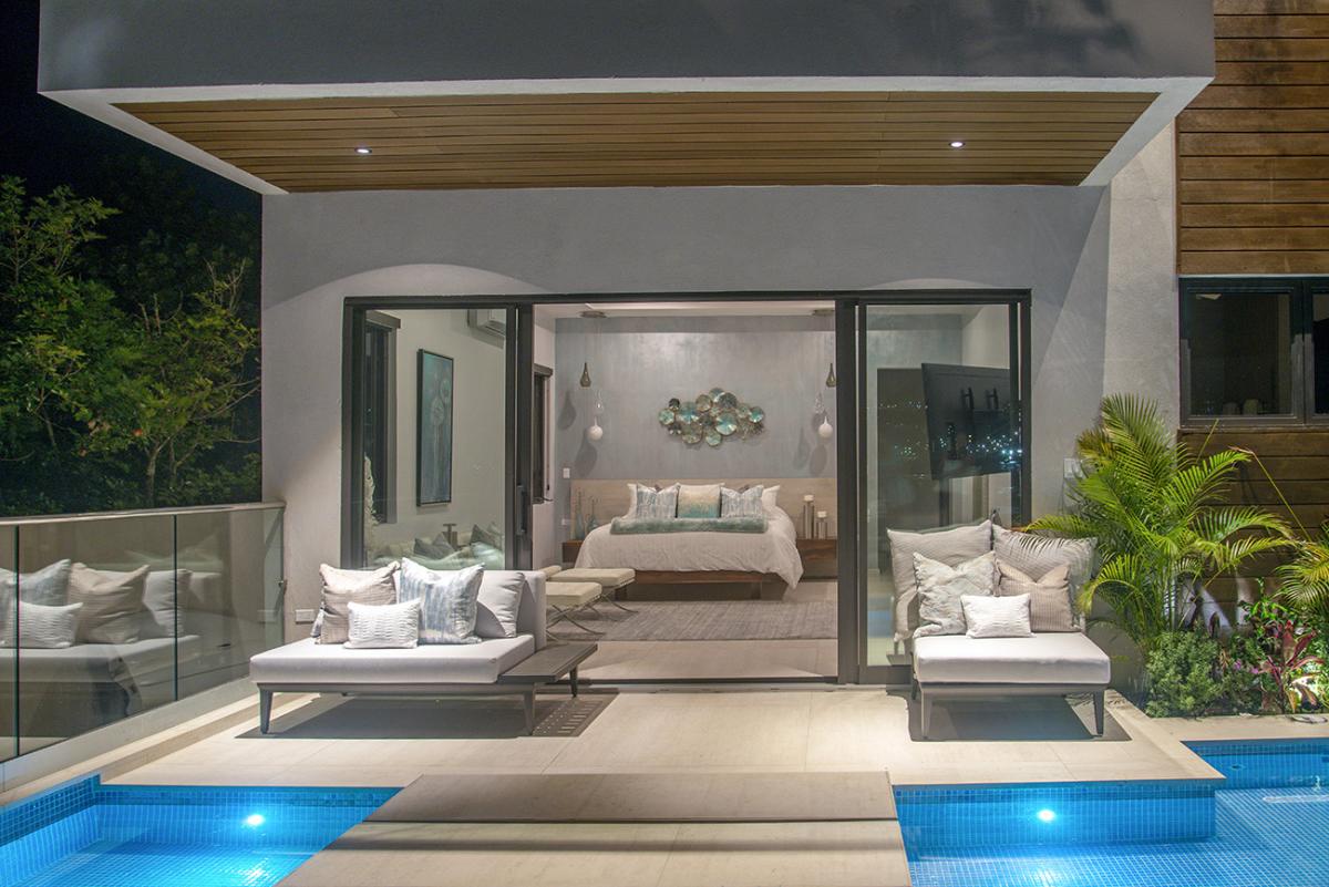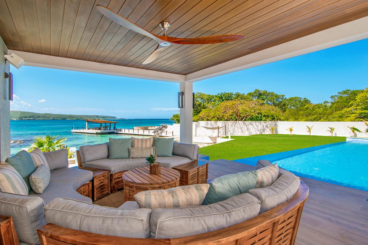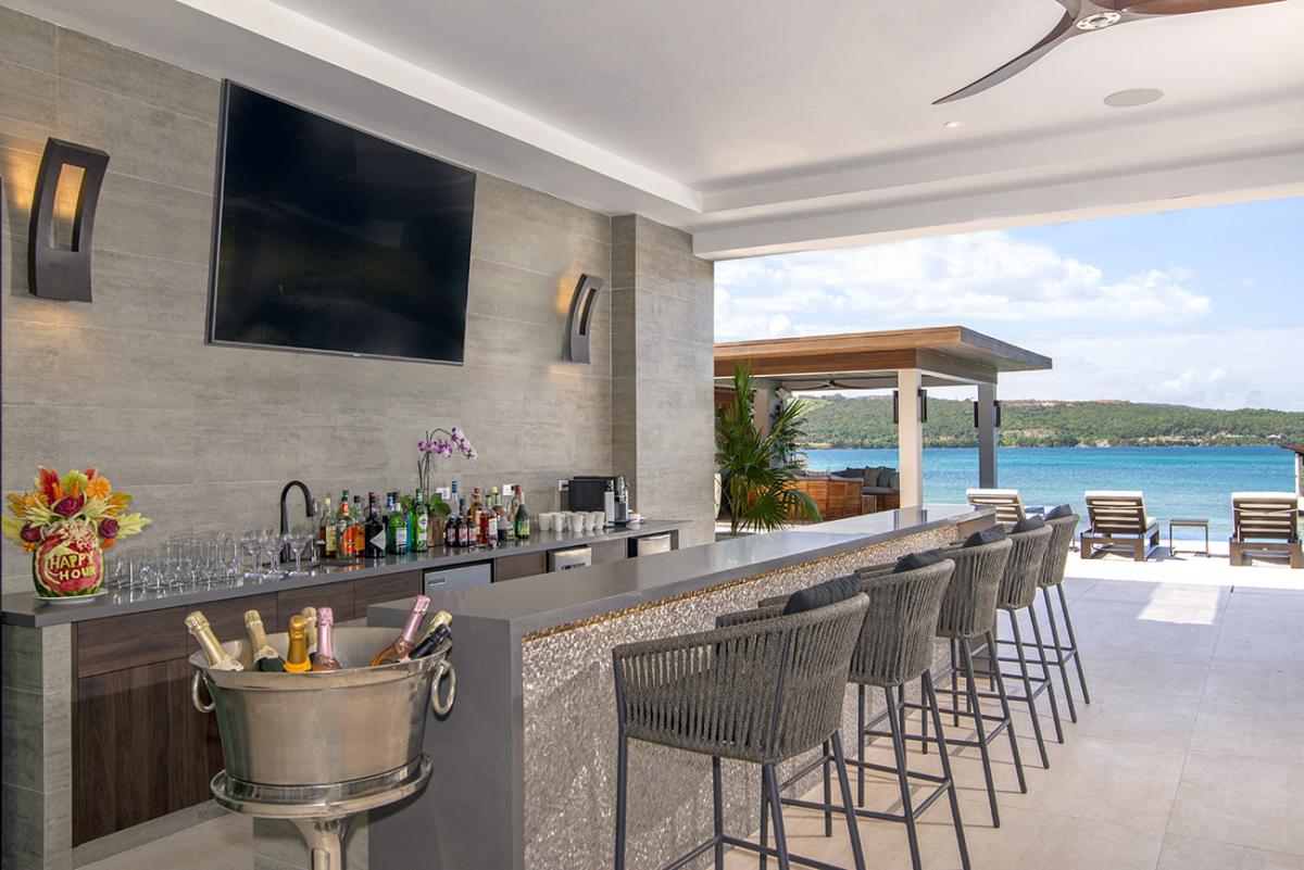 When entering the villa, there is a double-height entrance hall that leads into the main indoor and outdoor living areas. There is a formal dining room with a wall of windows to the left, while to the right, there is a comfortable sitting room with soft, deep leather sofas. To get onto the outdoor terrace with more dining space, seating, a large bar with a TV, and a cappuccino/espresso station, guests have to walk through one of the three 25ft doors. This covered terrace leads to an infinity pool, an outdoor kitchen, a gazebo overlooks a pool, a hot tub, and a grassy lawn. Happy Hour has many outdoor areas for guests to enjoy each other and the surrounding views.