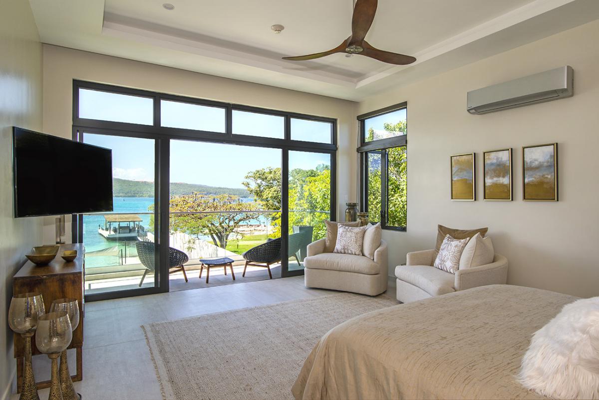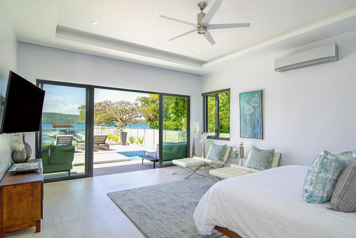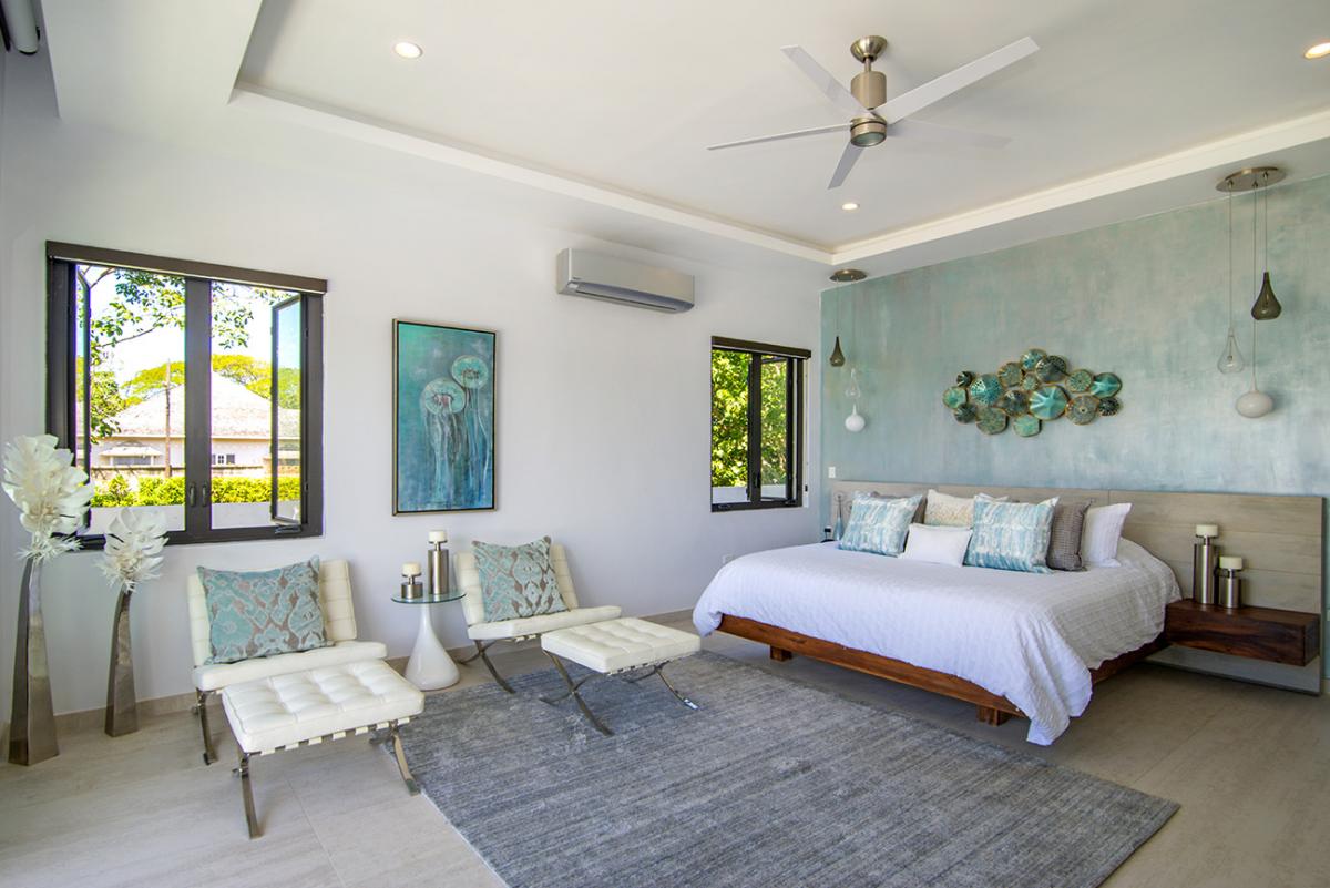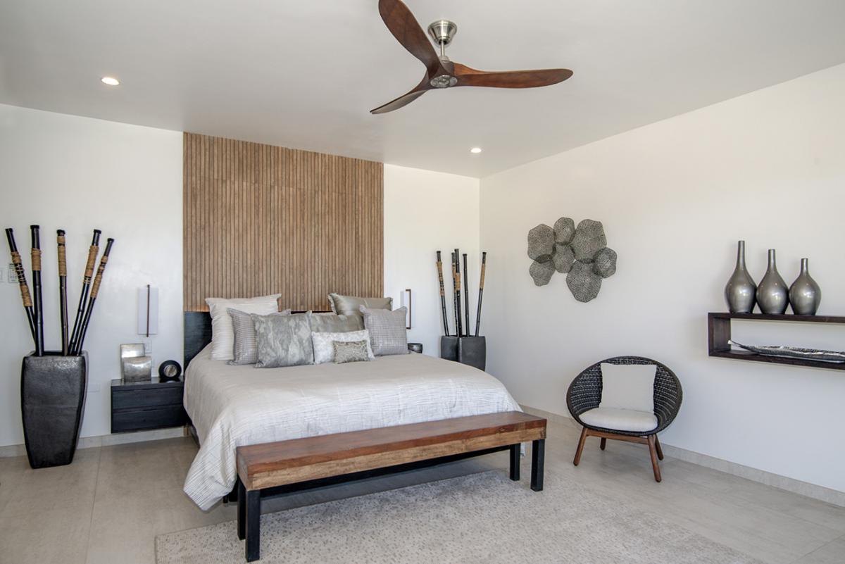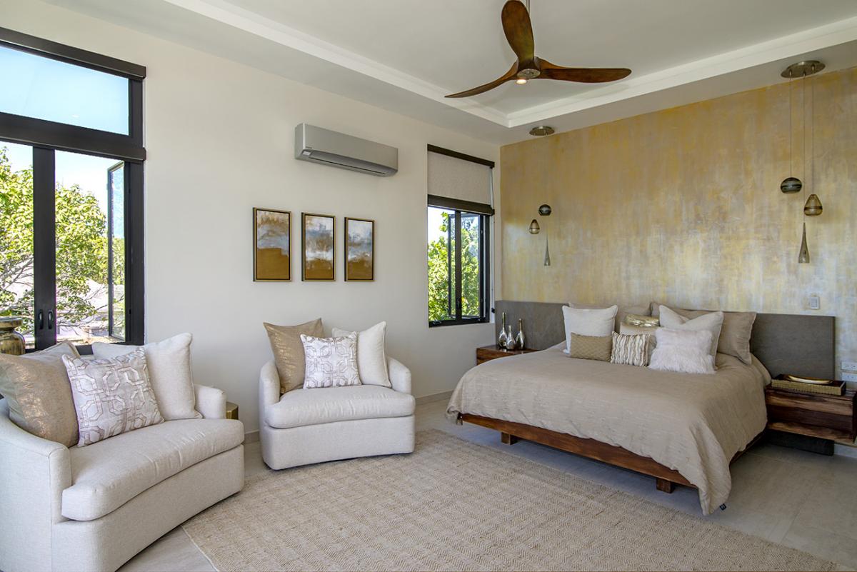 Bedroom 4: This room is located on the upper level and has a king-sized bed, remote-controlled air conditioning, a ceiling fan, a flat-screen TV, a personal safe, and a walk-in closet. The room also has an en-suite bathroom equipped with a walk-in rain shower, a double vanity, a toilet, and a bidet. A balcony that faces the ocean is also included.