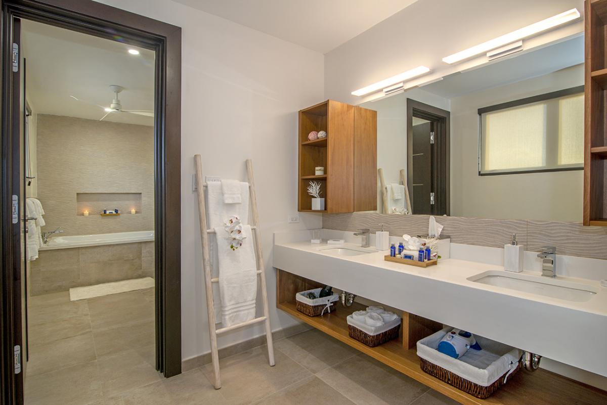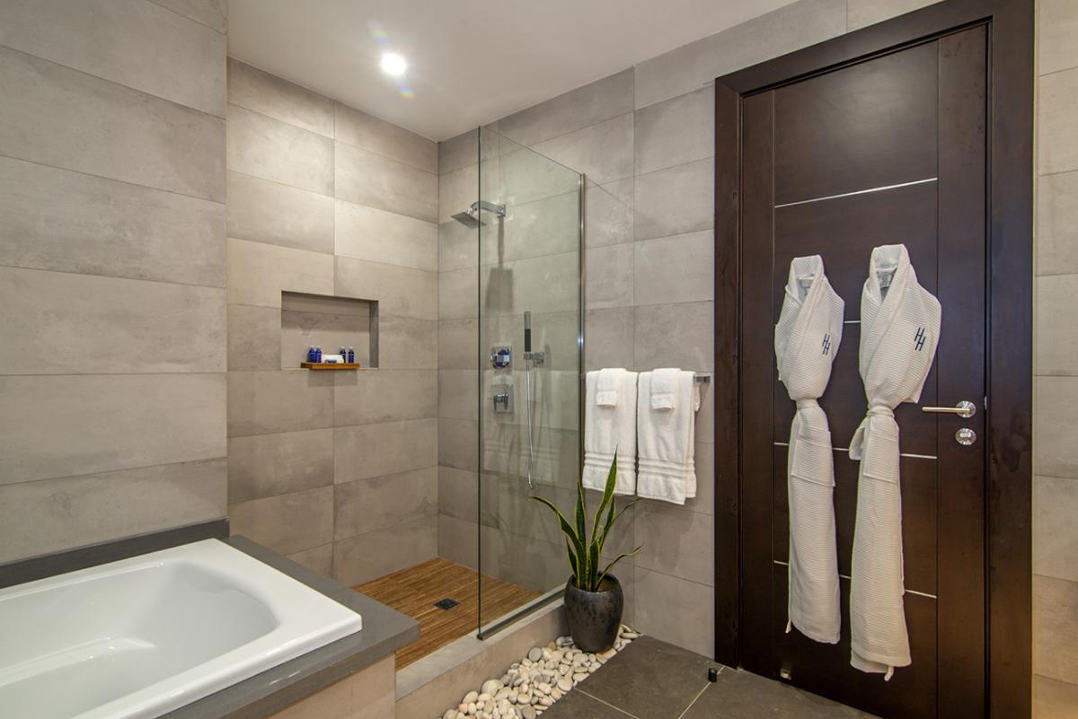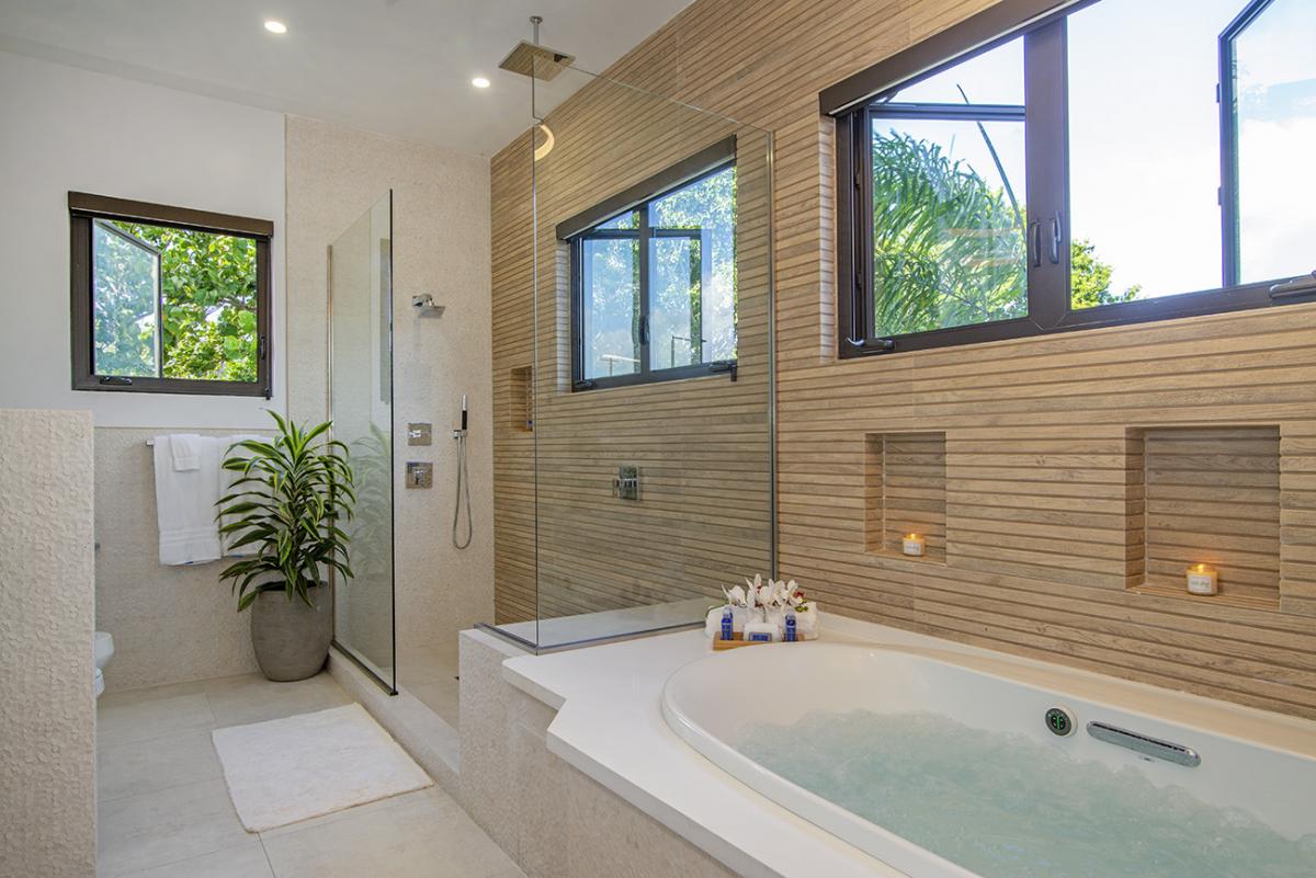 Primary Bedroom 1: This room is located on the lower level and has a king-sized bed, remote-controlled air conditioning, a ceiling fan, a flat-screen TV, a personal safe, and a walk-in closet. The room also has an en-suite bathroom equipped with a jacuzzi tub, a walk-in rain shower, a double vanity, toilet, and bidet. A veranda that faces the ocean is also included.