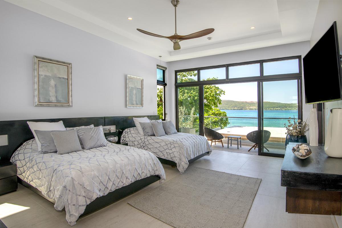 Bedroom 6: This room is located on the upper level and has two queen-sized beds, remote-controlled air conditioning, a ceiling fan, a flat-screen TV, a personal safe, and a walk-in closet. The room also has an en-suite bathroom equipped with a separate soaking tub, an over size walk-in rain shower, a double vanity, toilet, and a bidet. A balcony that faces the ocean is also included.
