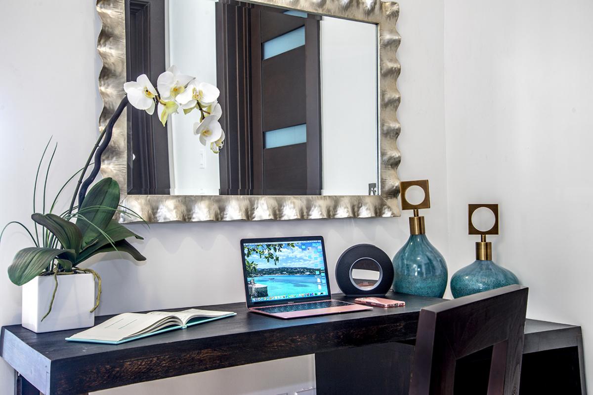 Bedroom 2: This room is located on the lower level and it has a king-sized bed, remote-controlled air conditioning, a ceiling fan, a flat-screen TV, a personal safe, and a walk-in closet. This room also has an en-suite bathroom equipped with a walk-in rain shower, and double vanities. A veranda that is facing the ocean is also included.